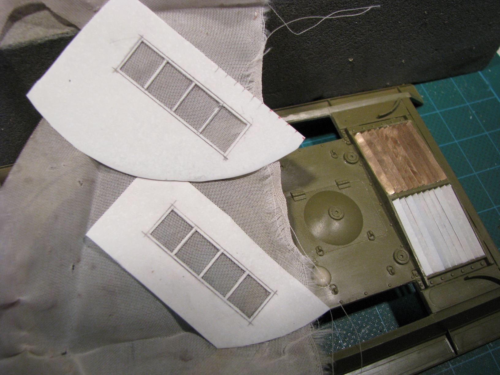 Использовав для изготовления жалюзей первой секции листовой металл толщиной примерно 0.1 мм, для второй секции решил попробовать пластик толщиной примерно 0.2 мм. Соотносясь с масштабной толщиной этих элементов и учитывая простоту обработки и подгонки на будущее, я отдал предпочтение пластику. Уже после начала сборки был куплен набор траков на поздние КВ и ИСы средней серии от фирмы «Восточный Экспресс», после чего была сделана попытка сделать их рабочими.