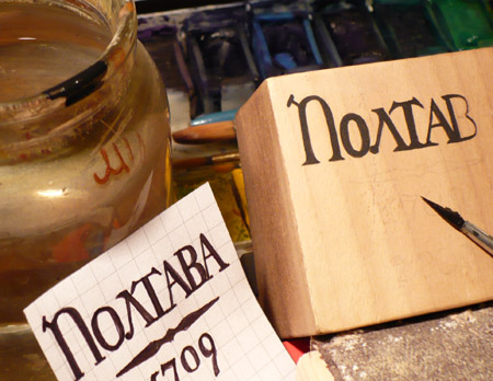 Приступаю к нанесению надписи на тыльной стороне подставки. Я не указал выше, что в качестве шрифта для шаблона был выбран т.н. "петровский", гражданский шрифт (крупного кегля, обр.1707 года) - http://speakrus.ru/articles/peter/peter1a.htm .