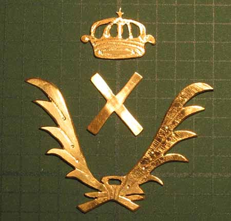 Для изготовления накладных декоративных элементов я выбираю листовую латунь светло-желтого цвета. Вырезаю заранее нарисованный шаблон из бумаги (см.выше) и наклеиваю на латунь. Используя в качестве основного инструмента ручной лобзик и пилку по металлу, выпиливаю элементы по границе шаблона. Заусенцы и неровности убираю при помощи надфилей. Ими же придаю окончательную форму. Достигнув желаемого результата, счищаю шаблоны с готовых элементов и шлифую наждачкой.