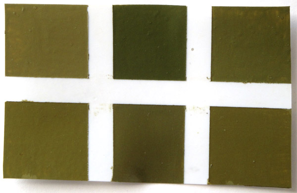 Водорастворимый акановский 4БО сверху по центру, по сторонам от него осветленный. Нижний ряд, цвета намешаны из акрила Vallejo.