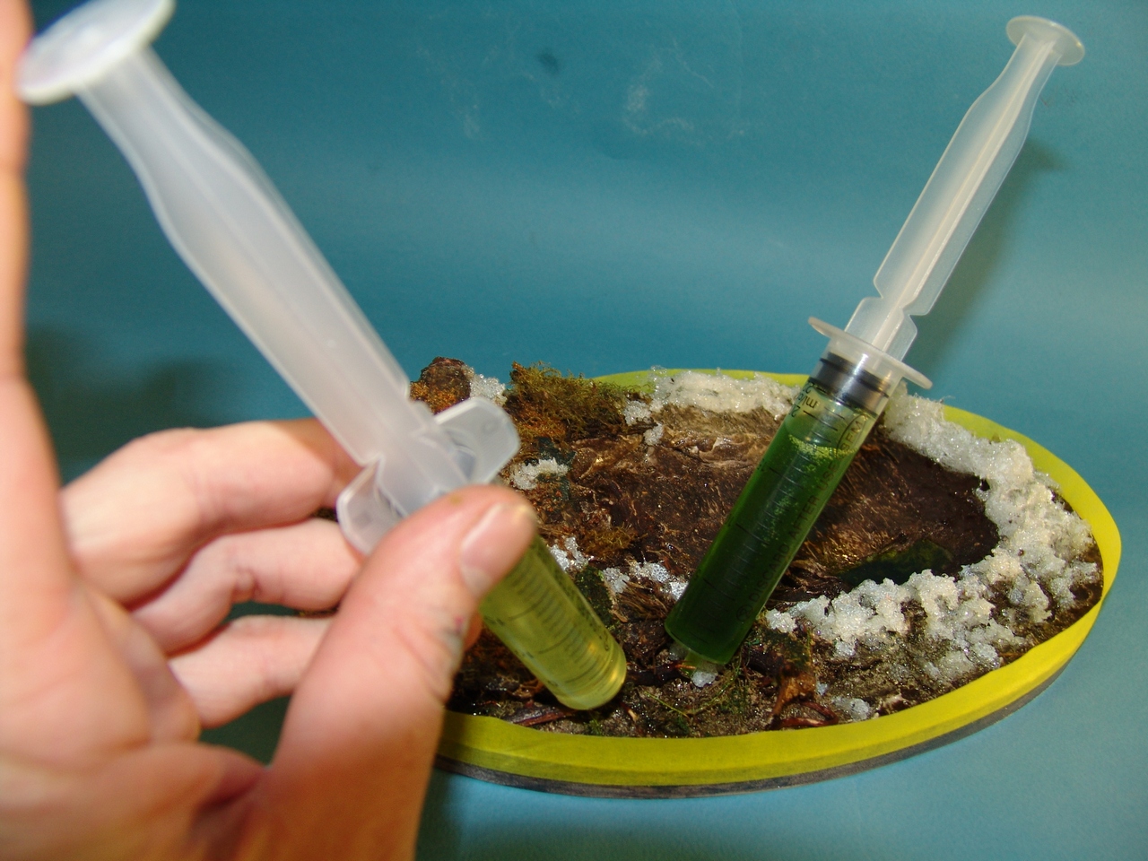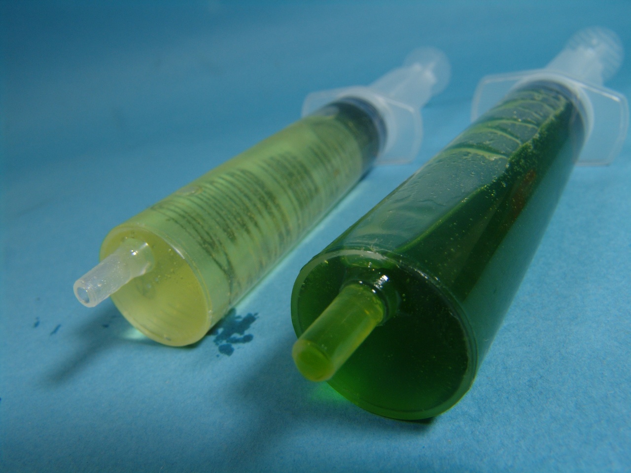 Думаю ,что всем понятно,нет на свете ничего просто одного цвета и потому заряжаю подкрашенную эпоксидную смалу в кубовые шприцы.Для того чтобы можно было одновременно заливать несколько оттенков,в нужные места.Жижа постепенно на месте сама проникает в саседний цвет,создавая плавный переход.