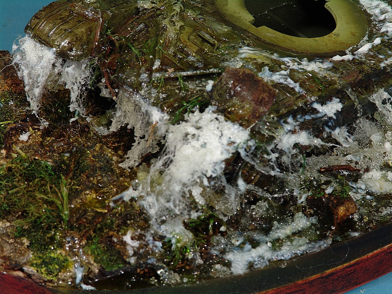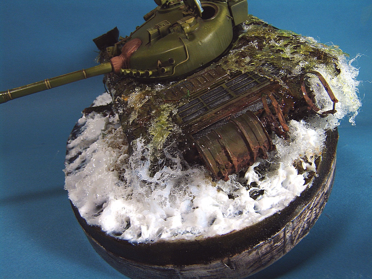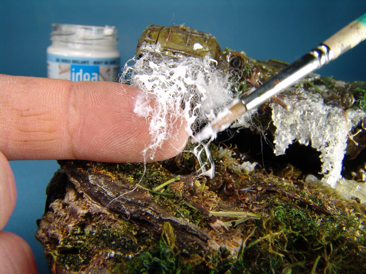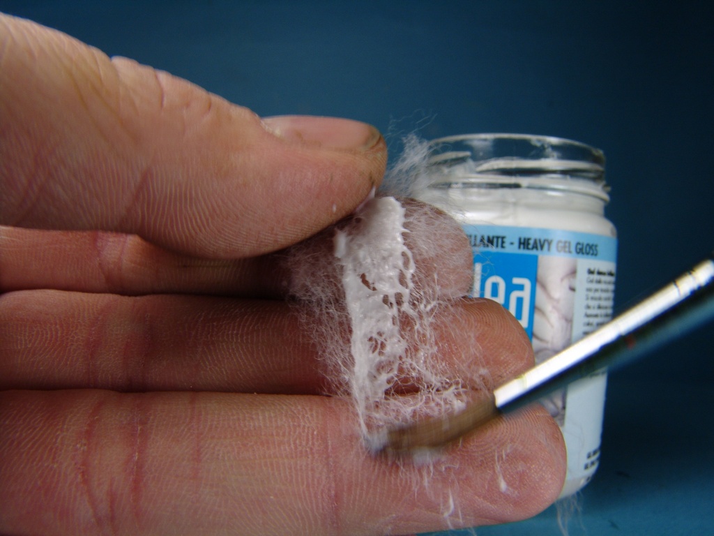 Под гусеницы,напихиваем синтепон который промазывается гелем.Через несколько часов,каждая ворсинка становится жесткой и на неё можно наносить следующий слой геля.Лишние ворсинки торчащие в ненужном направлении,позже обрезаются.Контролируем количество и общую картину,которая подумывалась изначально.Пока синтепон сохнет,его можно располагать,как вам захочется.Менять направление брызг или будущий поток.