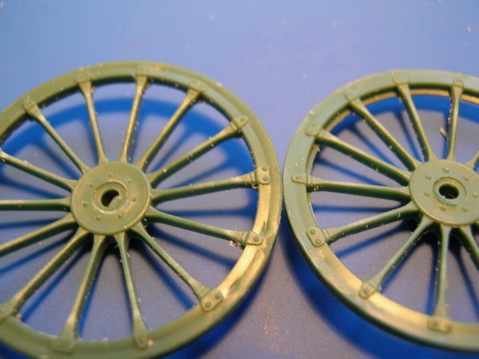 Для другого орудия на колёсах были срезаны крепления спиц, ободы прошпаклёваны, вместо травлёных дисков поставлены диски из тонкого полистирола, приклеены шины и накладки. Заклёпки и гайки пока не ставил. Колесо пойдёт под формовку. Надо будет ещё отлить пару для зенитного станка.