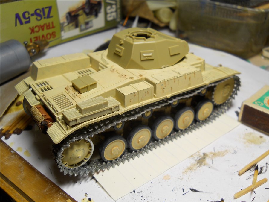 Собрал гусеницу, пока на одну сторону. Ох и не легкое это занятие чистить пластиковые траки. Кто работал с ними-поймет. На танке испытываю технику сколов методом карандаша. Может немного увлекся, но это пока -проба пера так сказать. Так же изготовил имитацию сетки на выхлопной трубе, делал из бумаги, пропитанной клеем. И еще, вопрос в догонку-синим цветом на фото написан номеры машины. Кто знает, скажите пожалуйста, к какой дивизии могла относится машина ?