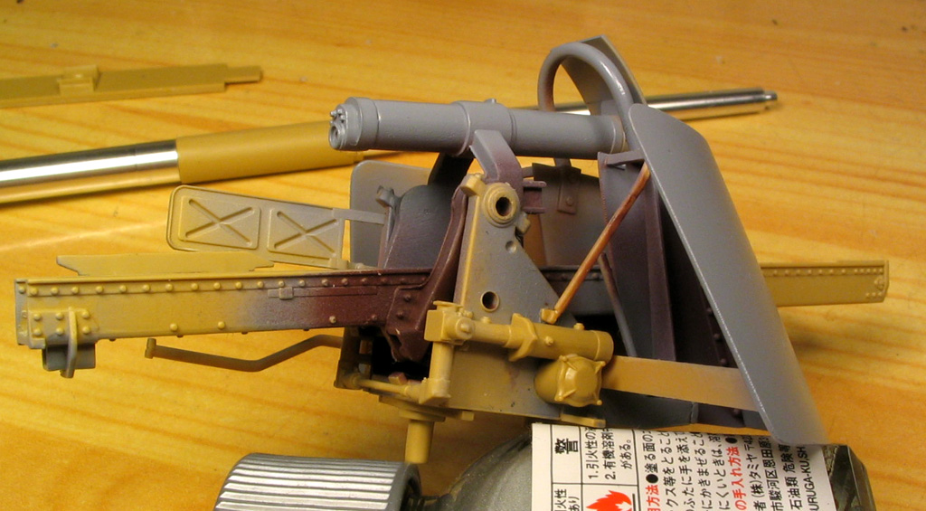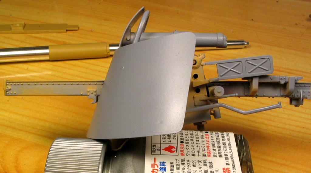 Теперь лафет, со щитом, то что мне нужно собрать окрасить и попытатся воткнуть на место. Тут опять не обошлось без курьёза. Я вначале установил дугу стягивающюю oбе половинки щита сверху, а потом установил тонкую гнутую пластину над стволом и она не вошла на место поскольку угол наклона дуги был не верным. Пришлось дуго аккуратно под корень срезать и стачивать низ под нузный yгол. Поэтому я вам рекомендую сначала установить планку и потом уже по ней подгонять дугу, естественно сверяясь с чертежом если он есть.