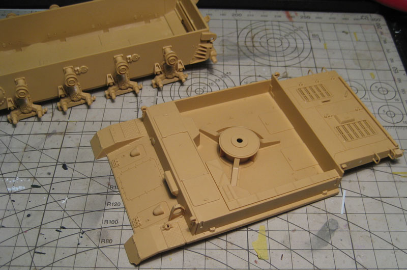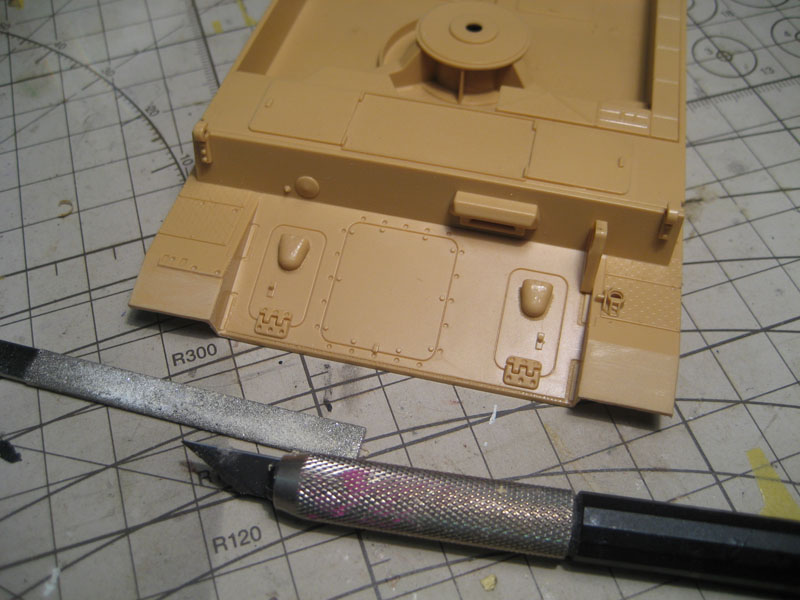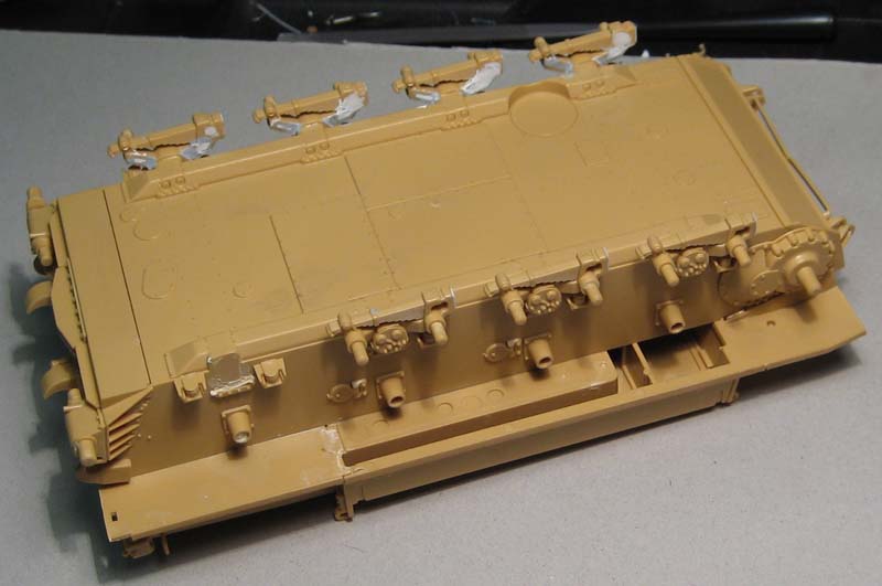 Работы по корпусу немного затянулись. Более детальное изучение матчасти выявило некотрые недостатки. Демпферы Тамия дает ранние, а на прототипе стояли уже поздние... Надо это всё менять. На помощь опять пришли лишние детали от тристаровских моделей.