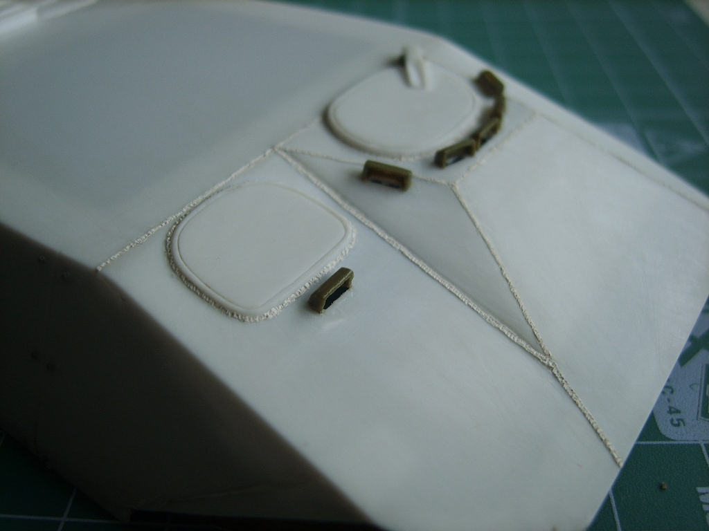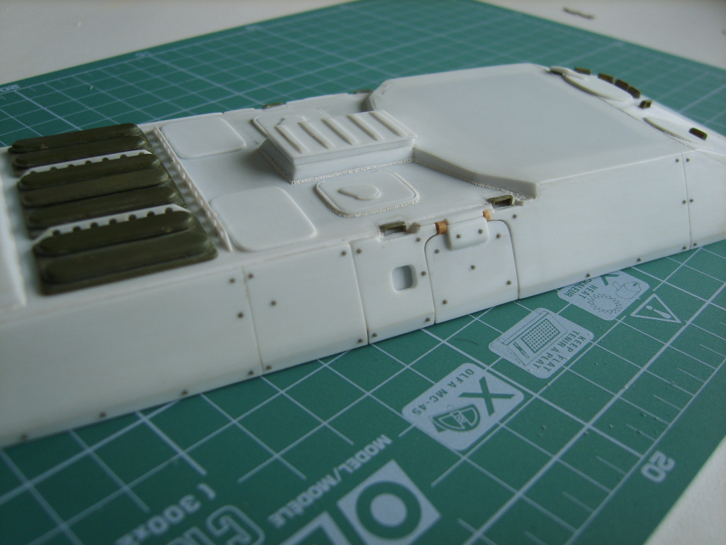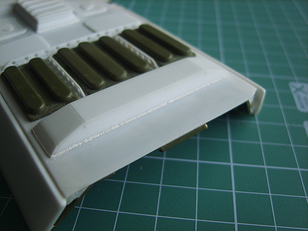 Из пластика самостоятельно делаю люки. Пытаюсь воспроизвести сварные швы из тамиевской шпатлевки, болты на шайбе мастерклабовские. Вообще данный проект в отличии от предыдущих