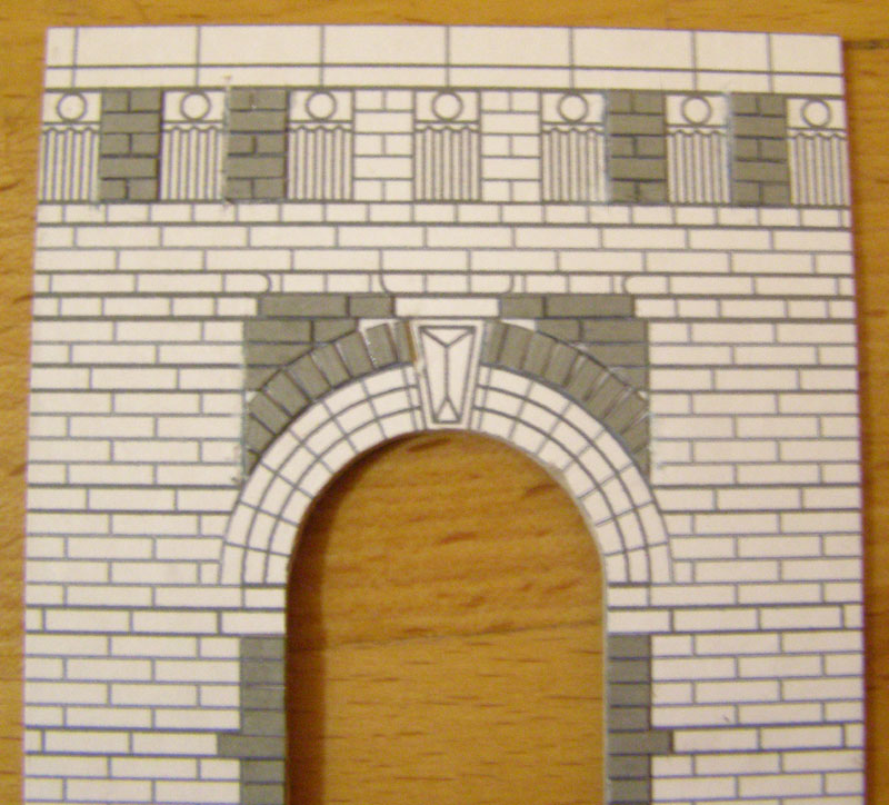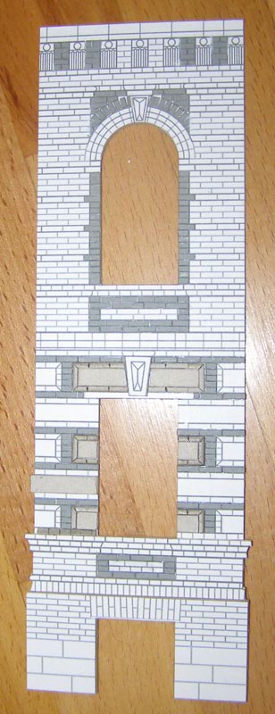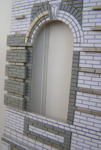 Картон режу с помощью толстой металлической линейки(2мм толщ.) - она намного удобнее, т.к. нож не соскальзывает. темно-серые кирпичи распечатаны на картоне и клеились на основу из толстого. На основание наклеен распечатанный фасад. А толстые размечаю с помощью измерителя, главная проблема с толстым картоном - он расслаивается на маленьких деталях. Закругления на кирпичах делаю с помощью нулевой шкурки, а потом покрывю клеем ПВА. Затем уже режу на отдельные кирпичи.клеется все при помощи ПВА, потом им же наверно и загрунтую, хотя еще точно не решил.