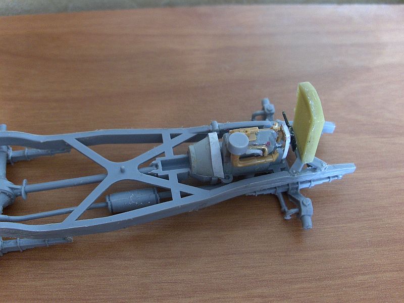 Решил приоткрыть одну боковую створку капота. Но смоляной мотор, в общем верный по форме, оказался напрочь неточным в деталях. Поэтому взял чертеж из блога моего уважаемого противника, и слепил из хлама - половину двигателя. Померил - вроде бы низковато расположен в бронекорпусе. Посчитал по чертежу - если поддон двигателя у Алана сколько-то на месте, то все верно!
