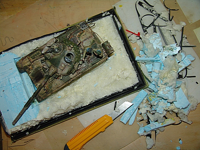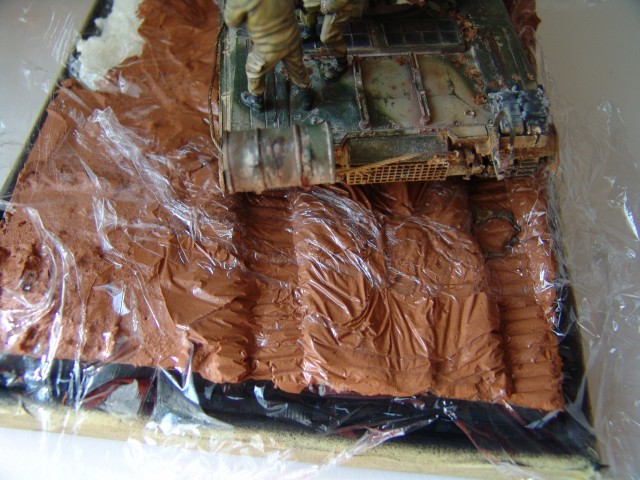 Я это делал строительной шпаклевкой. Наносил на твердое основание (бортик только надо сделать),главное чтобы не текла. Накатывал колеи, впихивал в грязь ящики,доски, раздавленные бочки, да что угодно можно. Позиционировал фигуры, технику. Впрочем, существует много способов сделать такую грязь. Можно Поиск поюзать, там по-моему было.