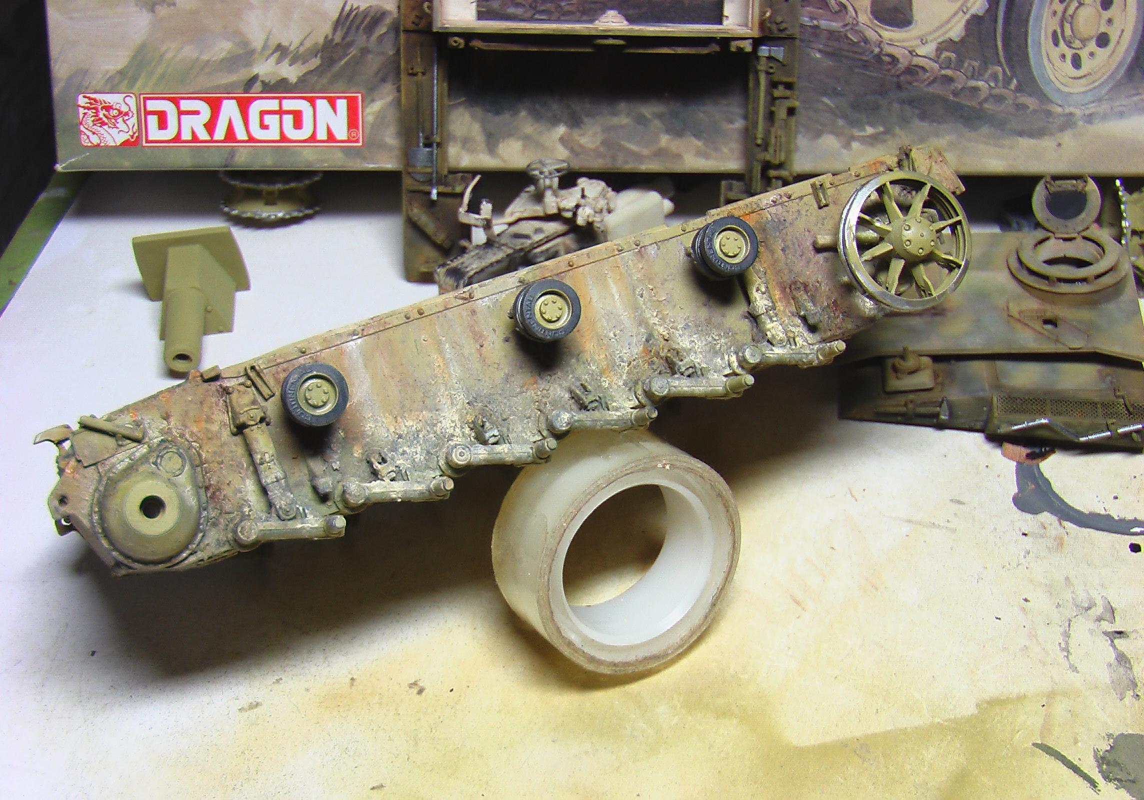 Честно говря даже представить себе не могу как это возможно.Гусянку собирал всей лентой сразу.В инструкции указано количество траков,которое понадобиться.НО!Не всегда это правда.Тут нужно смотреть по ходу работы.Кладем на столе трак гребнем вверх.Капаем мааааленькую каплю клея в углубления под следующий трак(тут я использую только клей с иглой "faller"у него игла тоньше,чем у Ревела,но это не принципиально.Можно и Звездовский кисточкой наносить.Но ели клея будет мало,то потом все развалится.)и так один за другим,пока не соберу всю ленту.Занимает минут 20-30.Собираю обе сразу.Катки и звездочки на сухую ставим на место.Но садиться должны плотно.Не падая.Не всегда получается так,тогда можно на каплю ПВА посадить.Ну и как только закончил вторую ленту,первую можно накидывать на катки.Огибаем звездочку,поддерживающие катки.Делаем провисы.Лента мягкая и великолепно гнется.Соединяю ленту по низу,обычно.Так удобнее.Накидываю вторую и оставляю на следующий день.Все снимаю и крашу по отдельности.Никаких проблем.Не на всех моделях можно так сделать.Иногда приходится делать ленту из двух половин.Передней и задней.Так и красить.Потом уже при сборке она будет стыковаться сверху и снизу.