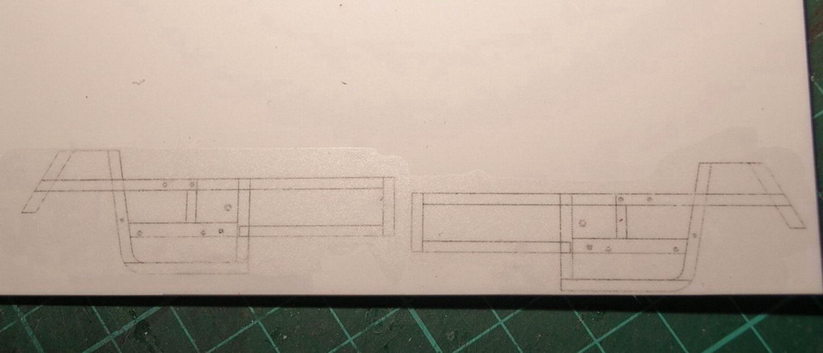 Ну а теперь начну собственно с модели.После распечатки чертежей на лазерном принтере, перевёл абрис стенок корпуса на пластик толщиной 1 мм.Таким образом создал как ьы каркас из перекладин обшитый фанерой.На боковых стенках сразу закрепил кронштейны для передних концов задних рессор хода.И "зашил" металлом из фольги пустоту.Вклемл поперечные перекладины и доски, формируя корпус.