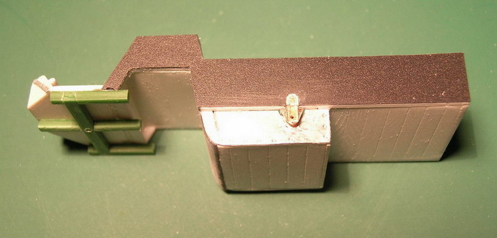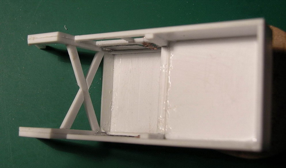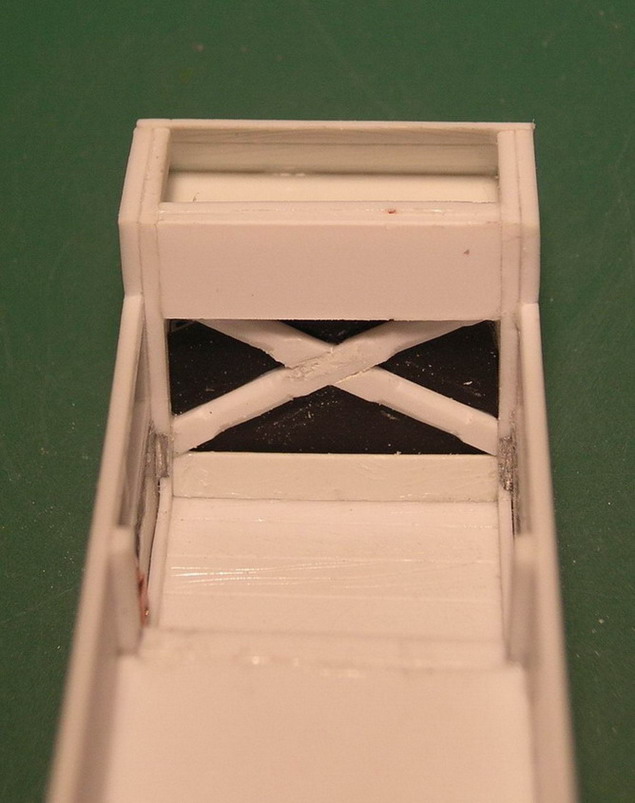 Продолжаю наращивать "мясо" на корпус. Из чёрного полистирола толщиной 0.25 мм. изобразил внешнее фанерное покрытие.Из обрезков полистироловой древесины склеил раму для поворотного круга переднег хода.