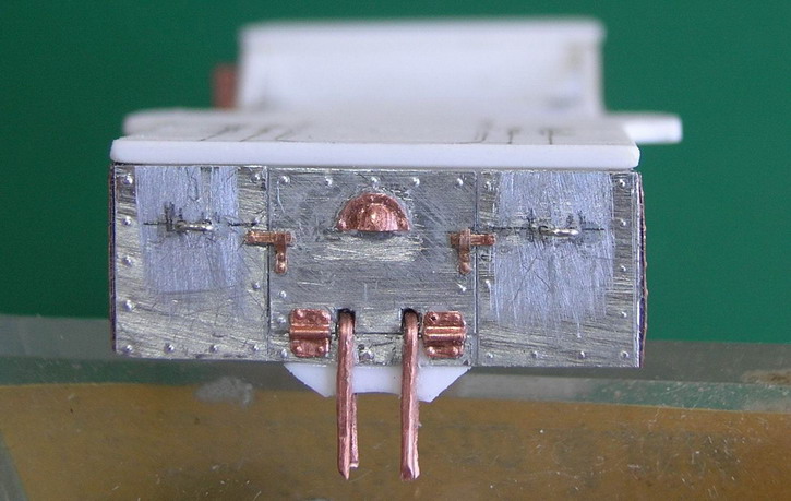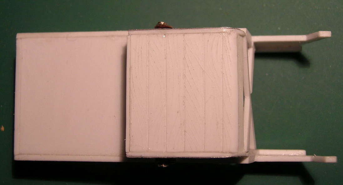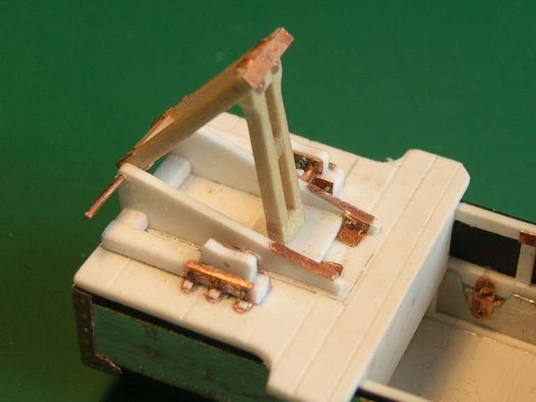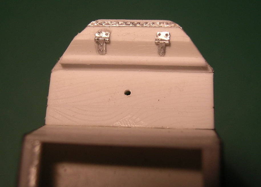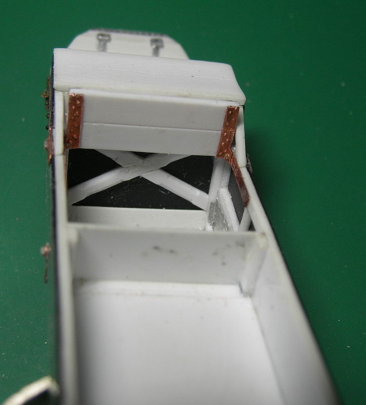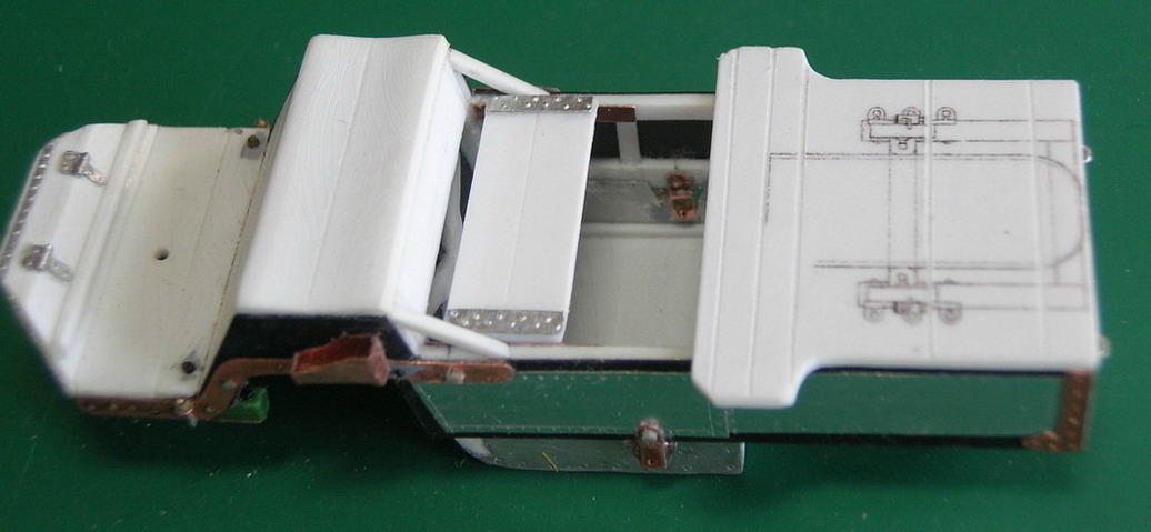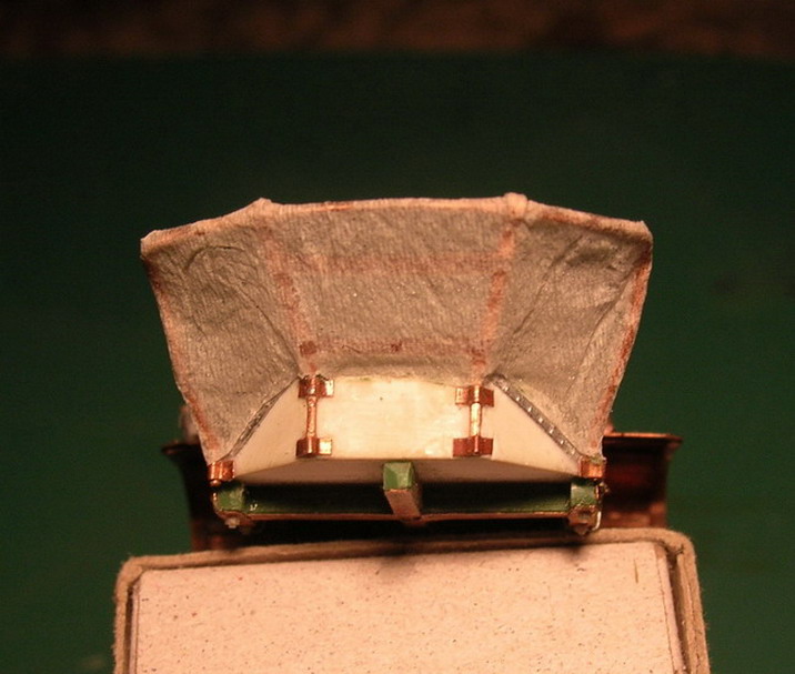 dpl, А я судовольствием покажу, ибо больше нигде показать кроме форумов не могу.Продолжаю.В передней части корпуса сгородил подножку (она же один из ящиков ЗИП).Сразу за сиденьем ездового установил откидывющееся сиденье для расчёта пулемёта.Покрыл корпус листовым железои из фольги.По бокам корпуса из медной фольги толщиной 0,2 мм. поставил усиливающие накладки. Такде сделал накладки на рвму поворотного круга.Слева от сиденья ездового приклеил металлическую "кабуру" Преддназначение оной не выяснил. По опыту изготовления моделей гражданских повозок знаю, что в подобную штку устанавливали рукоятки кнутов на стоянках. Возможно на стоянке в нем мог закреплятся приклад карабина ездового. На охотничьх шарабанах подобное встречалось. В задней части, тоже обитой металлом сделана имитация дверцы для фуражного ящика. Сразу вклеены стремена для крепления попречной рессоры заднего хода.На полке для пулемёта отпечатана разметка для станка пулемёта.