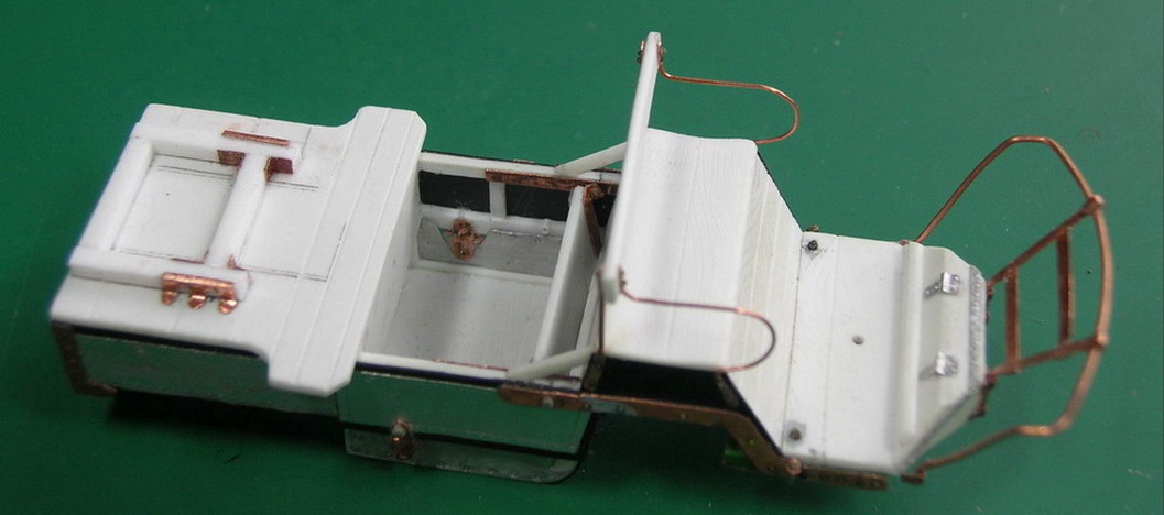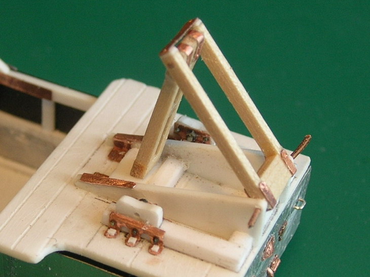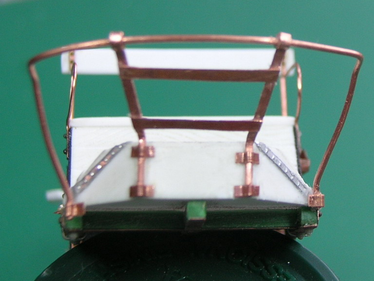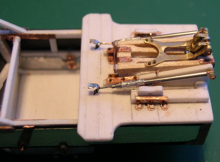 А я продолжу по своей коробочке.Показываю крепление усиливающих полоз снизу на раме поворотного круга.Они дополнительно закреплены болтами и стременами. Из медной проволоки и фольги сделал каркас для брезентовой накидки закрывающей ездового от грязи с копыт лошадей, поручни и стойки на сиденье ездового, приклеил спинку сиденья.Начал собирать раму для станка передка.