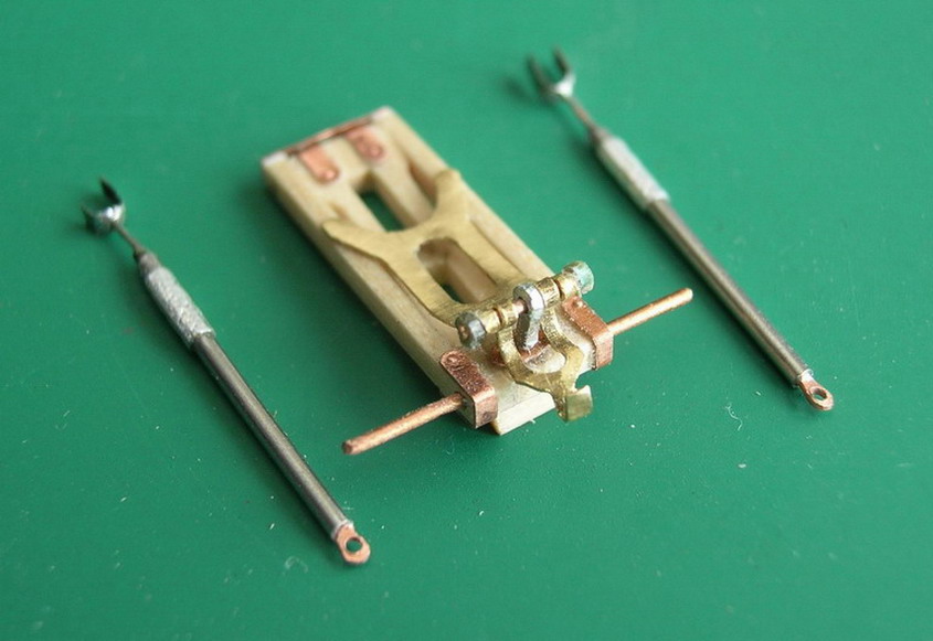 Продолжил потихоньку ковырятся над станком под Максим. (в ущерб зарабатыванию денег). Сделал из железных трубок и медной проволоки стойки для поддерживания боевой оси пулемёта при зенитной стрельбе. Из листовой латуни толщиной 0,2 мм. изготовил действующий замок для закрепления хобота пулемёта в обычном боевом положении. Закрепил все на раме станка. Все детали подвижны.