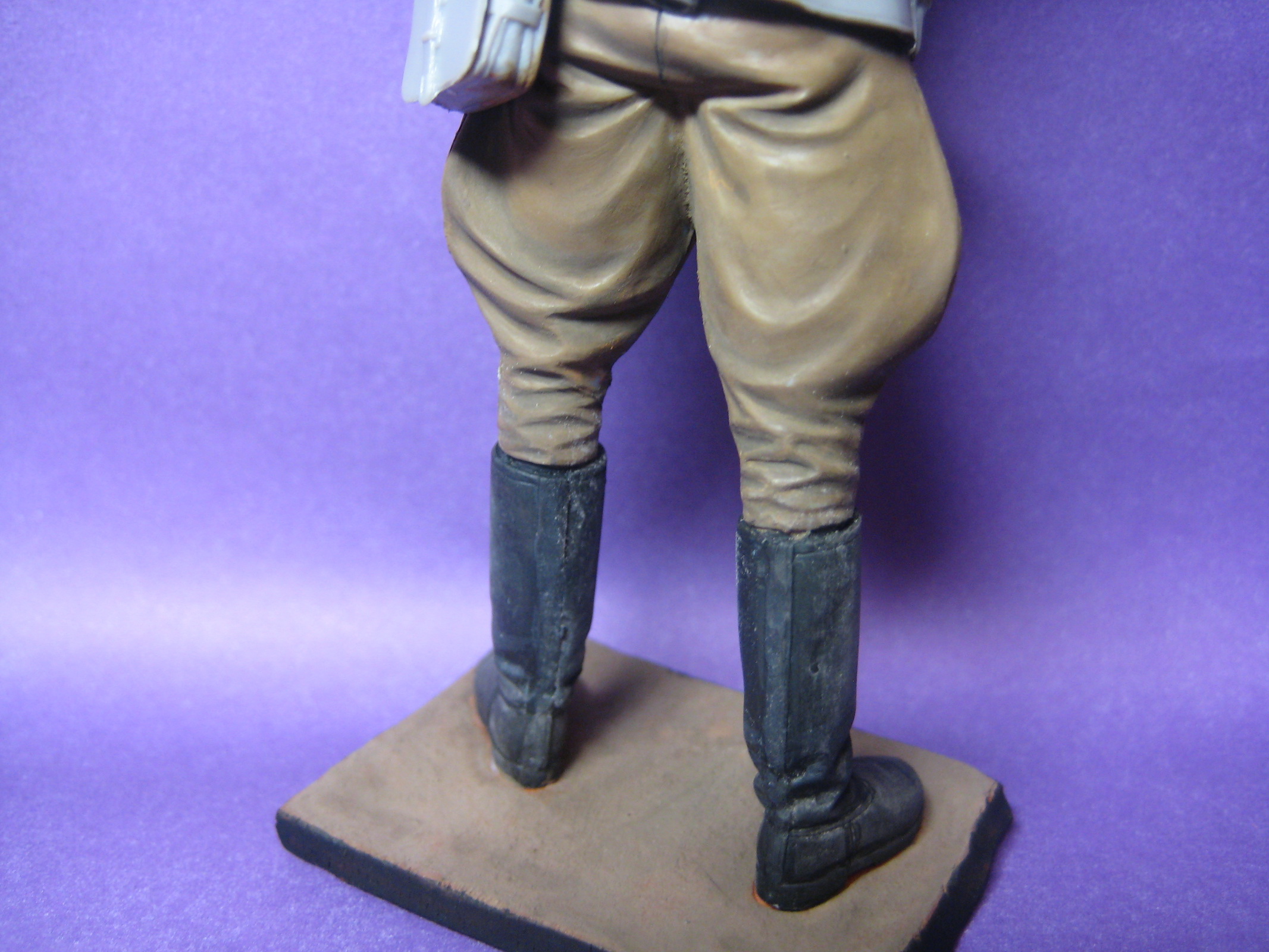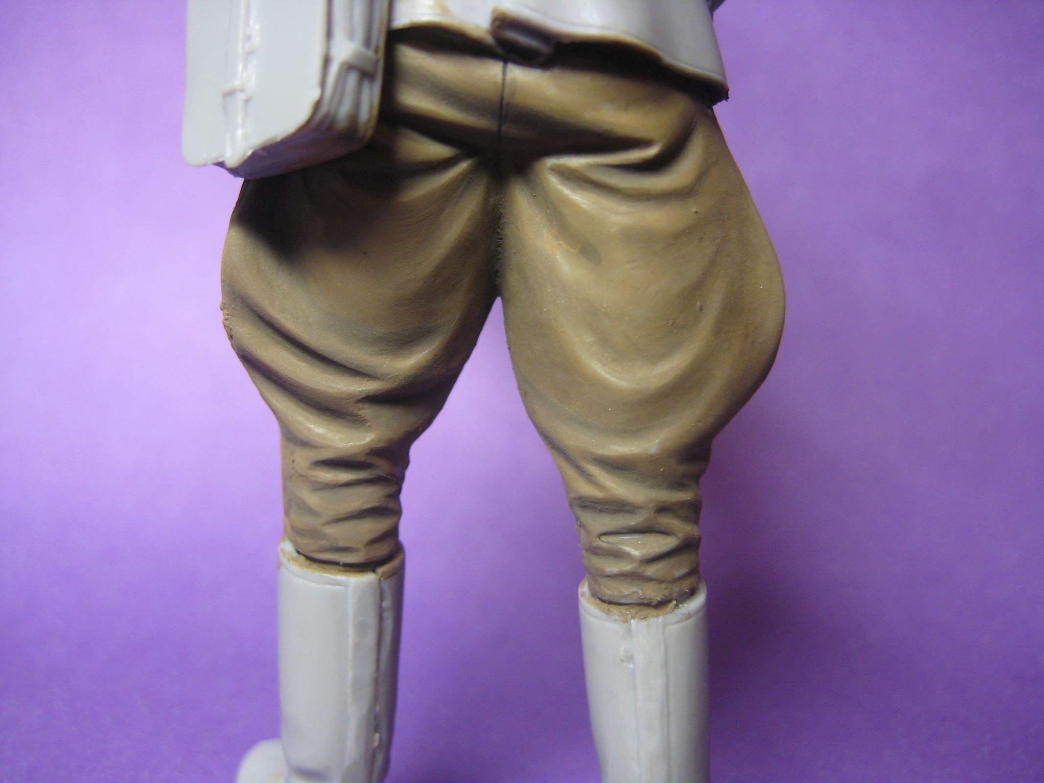 Пластиковая фигура без грунта вещь интересная - одно неосторожное движение пальцами и можно легко снять краску (на складках галифе как я понял так и произошло),тем более загрунтованная фигура более удобна в плане лессировки, так что пока процесс росписи не дошел до стадии когда всё переделывать лень может есть смысл начать всё заново с отмытой и загрунтованной фигурой?