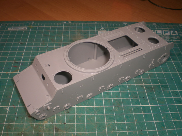 Гужоны я уже сделал, из двухкомпонентной шпатлевки, так же переделал стык кормового бронелиста и днища и установил на место грязеочистители (с ними пришлось много повозится из-за сильного смещения половин пресформ, поэтому (местами) с одной стороны деталь пришлось стачивать почти на половину, а с другой наращивать листовым пластиком) и ведущие звездочки.