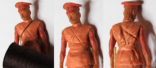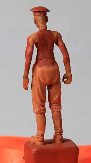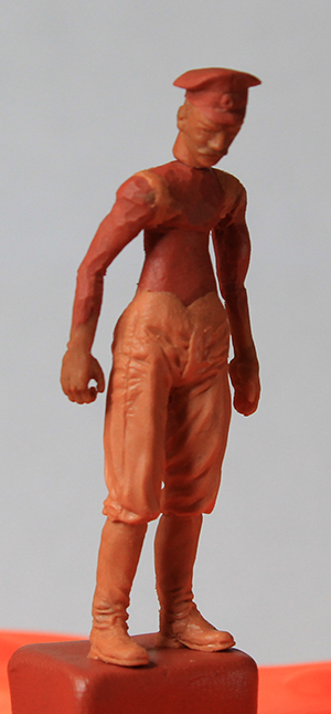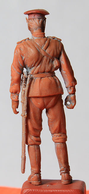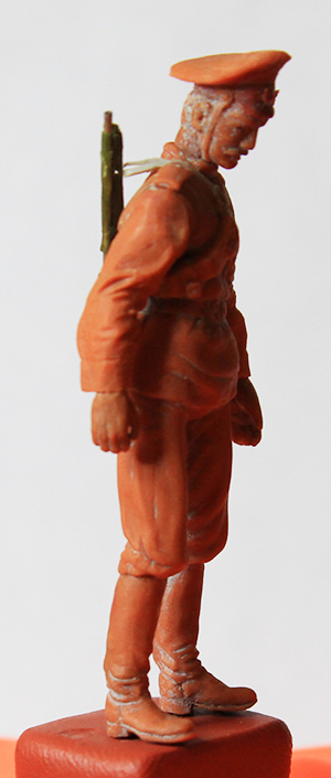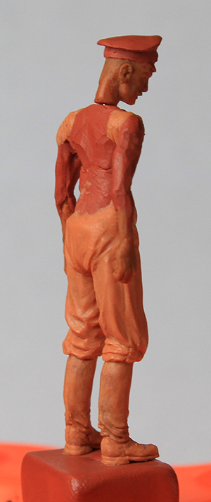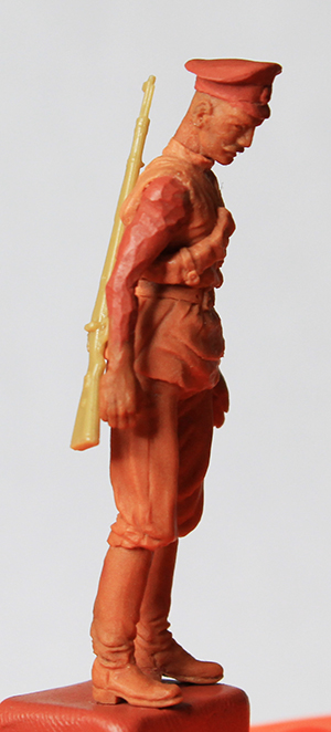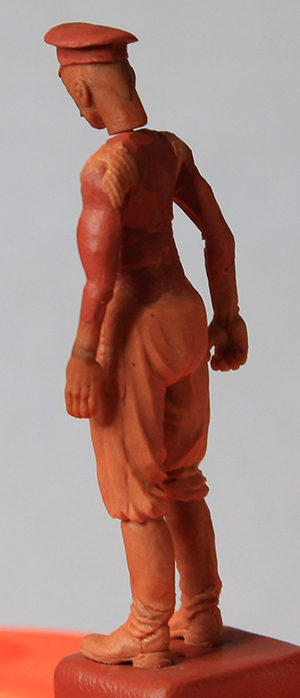 Уважаемые коллеги, спасибо за оценки и внимание к моему скромному труду дилетанта. Сапоги и шаровары закончил. Положение ног пришлось поправить. Слишком кривая была левая нога: не иначе – травма. Добавил объёма торсу. Денис, спасибо за поддержку! Завала фигурки назад-вперёд вроде-бы нет. Посмотрим. Сформировал основные складки (прикидочно), обвесил фигурку временным оружием. Само-собой маузер и точёную из литника временную шашку, являющиеся сейчас габаритно-массовыми макетами, заменю в дальнейшем. После обвеса разметил снаряжение. Для разметки всегда пользуюсь нитками. Так у меня получается точнее. Нитку протягиваю от точки до точки, натягиваю – готово: след ремешка отпечатан. Заготовка гимнастёрки готова, теперь снова: работать, работать…