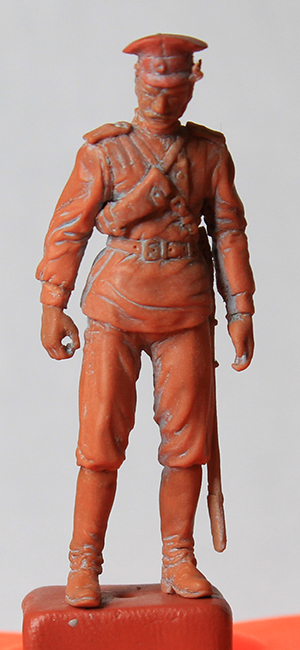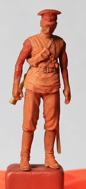Продолжаем. Выходные – время внука, однако казак, вроде-бы, готов. Шашка не закреплена, ремешок, соответственно, тоже. С оружием морока. Чужое брать не хочу, пытаюсь сделать своё. Проблемы с выбором материала решались, как всегда, методом проб и ошибок. Начал с простого – с шашки. Первая была временной из литника. Вторую слепил из Fimo. Неудача. Материал слишком хрупок. При посадке по месту сломал несколько раз. Попробовал сваять из Cernit. Снова незачёт. Резиновость материала не дала работать с мелкими деталями. Остановился на смеси Fimo-Cernit 1:1. Результат удовлетворил. Шашка получилась в меру гибкой. Теперь вожусь с второй версией карабина Мосина обр. 1907 г. Последний из указанных материалов результата из-за моей криворукости должного не дал. Пробую сделать из зелёнки. Если долго мучиться… Всё равно получится!...