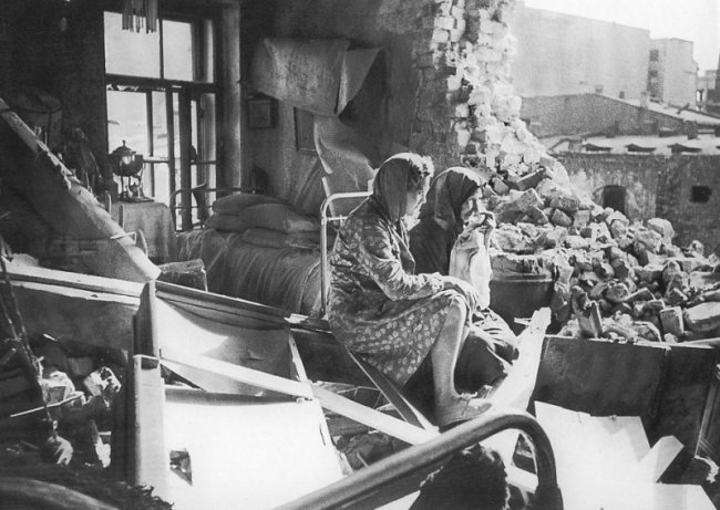 Фото, где женщина со старушкой сидят в разбитом доме, снято в Ленинграде в 1941 году.