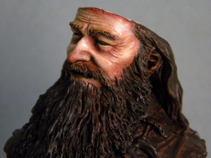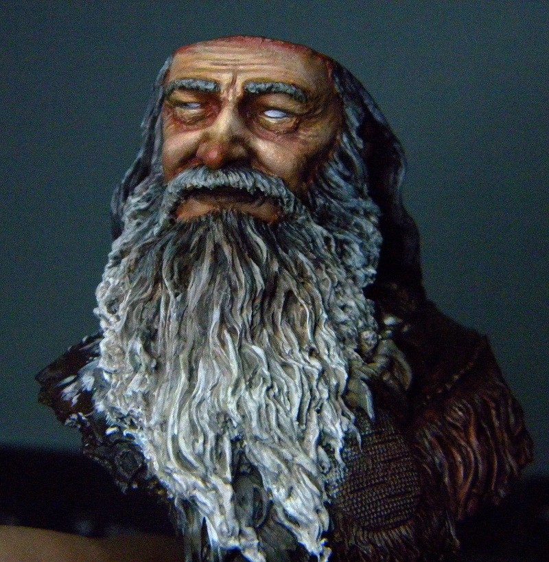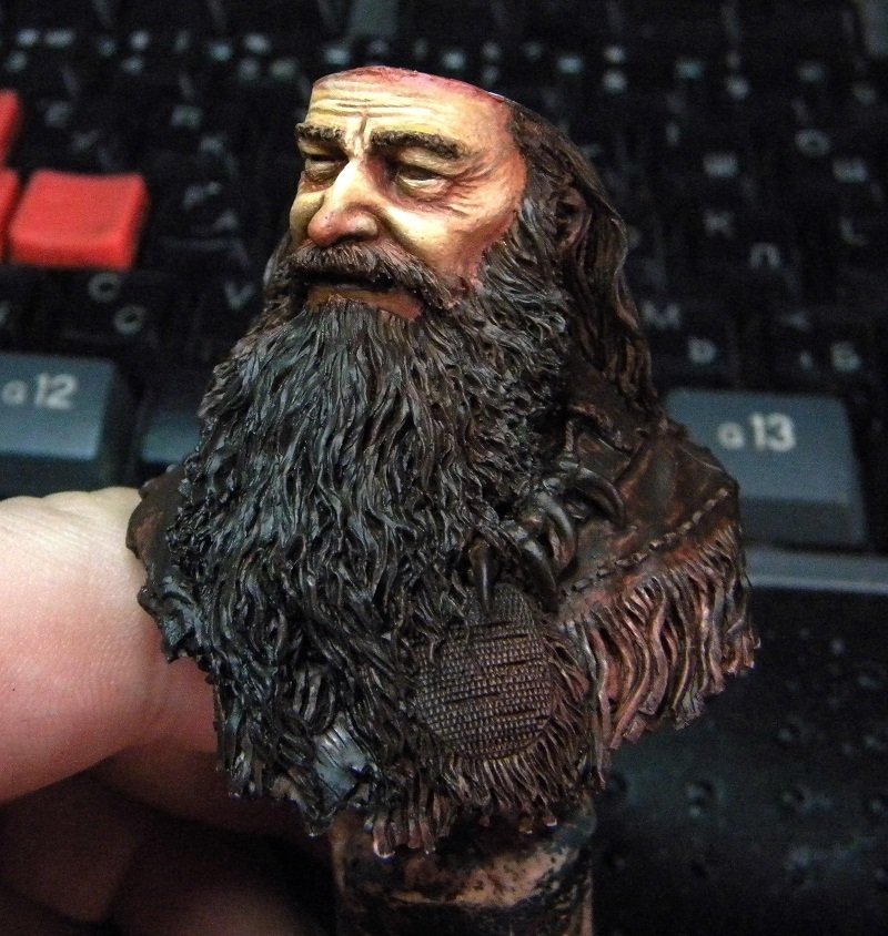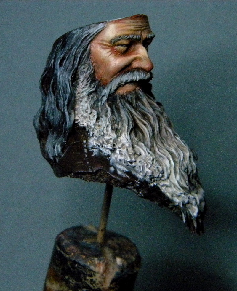 Следующим шагом я обработал акрил кожи смесью масла-сиенна жженая+неополитанская оранжево-желтая + билила титановые. Масло оживляет кожу поэтому на больших площадях оно просто не заменимо,по моему мнению. Самая большая ошибка многих кто рисует маслом кожу на миниатюрах - перебор с белилами в конечной стадии -получается кожа обработанная мукой(что особенно заметно на многих работах у Русского Витязя) Я же обычно масло использую в середине процесса- далее (после того как оно высохнет) я продолжу обрабатывать кожу акрилом. А пока масло сохнет -займемся бородой и волосами. Пока я даже не знаю с чего начну)Может быть сделать его седым как Гендальфа?)