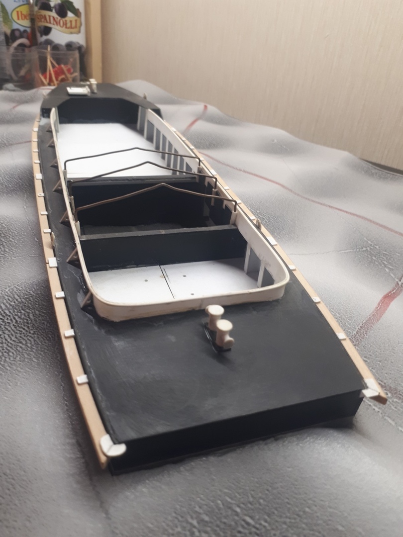 Сделаны киповая планка, кнехты, люк в форпик и дуги под брезент над моторным отсеком.