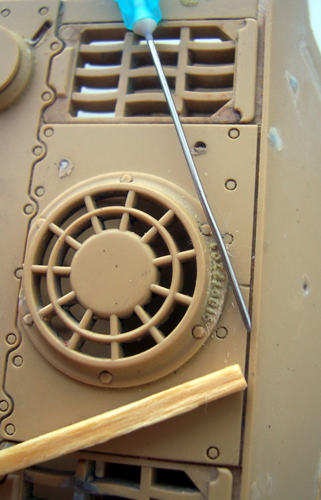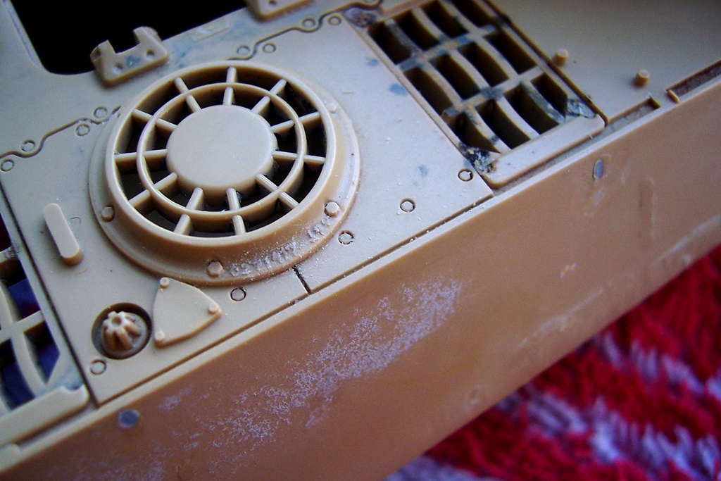 Итак, очень маленькое(в прямом смысле слова) продолжение. На решетках воздуховыводов у королевских котов были литьевые номера. Причем очень мелкие. Попробовал выполнить их из шпаклевки. Хотя высота цифр и получилась меньше 1мм, но все равно номер вышел чуть больше, чем надо, поэтому нужное количество цифр не набралось. Но скорее всего остановлюсь на этом. Выглядит пока не совсем аккуратно, когда шпаклевка высохнет, подрежу и подчищу.