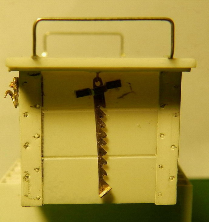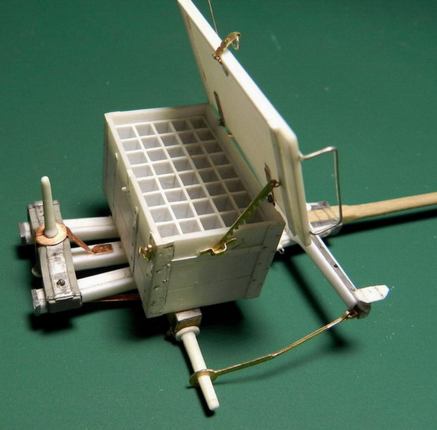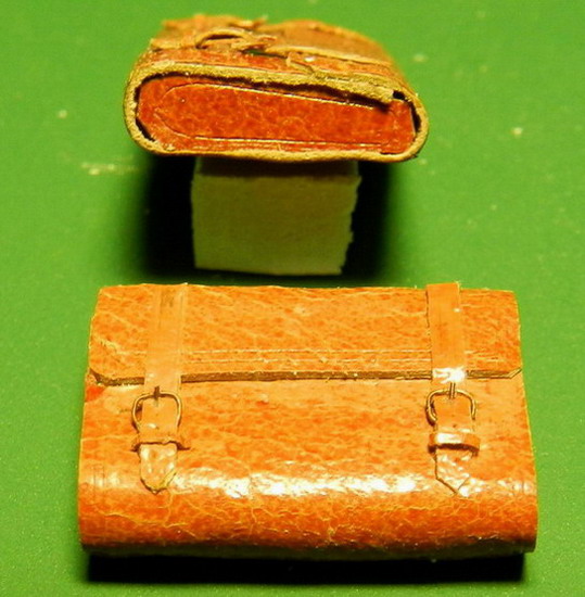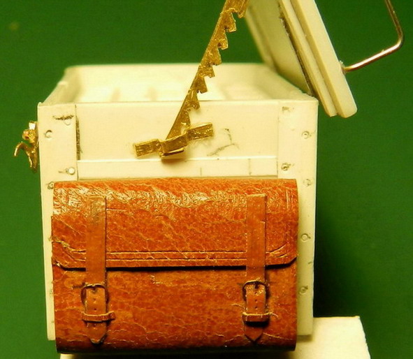 На передках раннего типа инструменты и принадлежности размещались в малом ящике крепящемся спереди от большого. Но к 1845 г. стали делать две кожаных сумы по бокам ящика из чепрачной кожи.Такие я и склеил из сбрусованной до толщины 0,1 мм. кожи. Захотелось поиграть. Хотя из полистирола тоже склеил. Блеск хочу убрать матовым лаком.