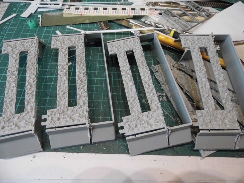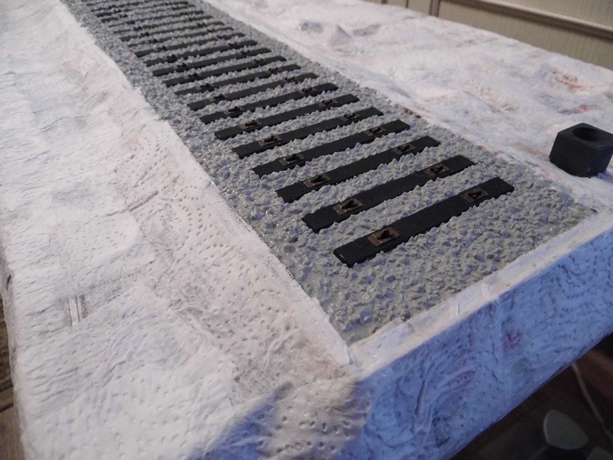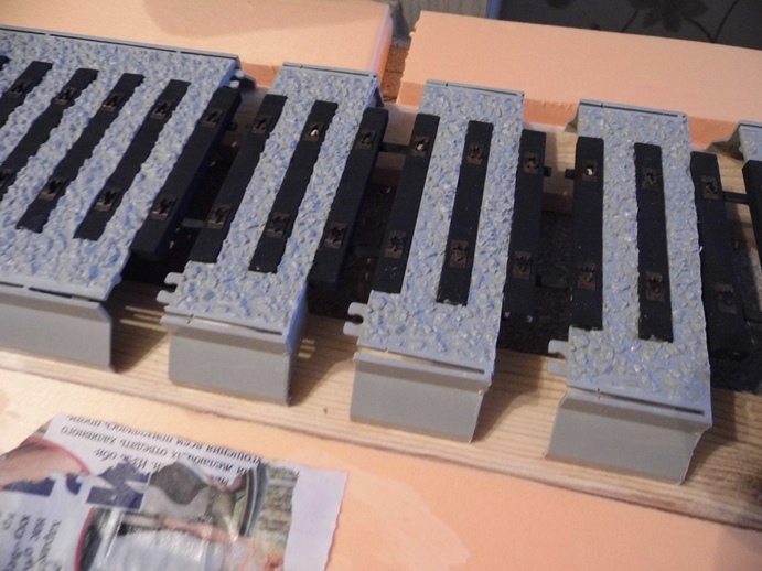 Каждый набор имеет оконечные детали, у которых шпалы можно закрепить только до середины. Пришлось отпилить и использовать с промежутками. Правда все, что ни делается - все к лучшему. На диораме буду создавать покилометровый запас. Нужно было бы выпилить места для шпал, на которые потом ложат рельсы, а здесь уже все готово...