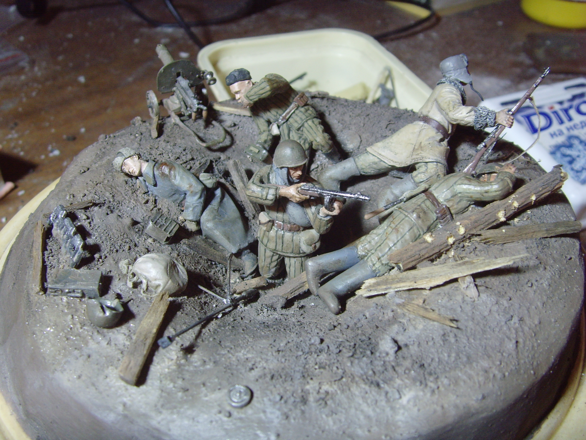 Уколов Михаил, совет на будущее - не используйте в качетве павших бойцов стоячие или сидячие фигуры, в итоге выходит очень слабо. либо воздержаться, либо слепить с нуля, либо переодеть в нужный костюм (в данном случае в шинель) лежащую фигурку, у которой нет проблем с анатомией.
