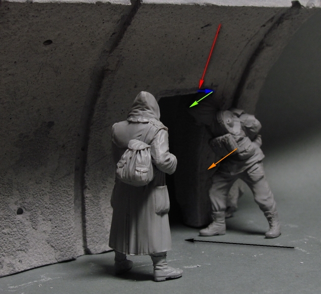 Mr_Painter, мужик "стоит капюшоном" слишком близко к стенке, красной стрелкой показано. Начало капюшона по синей стрелке отодвинуть надобно ну, как минимум, соответственно и всю фигуру, естественно. Получается, что прилип/влип в стенку головой чудак - не смотрится, извините, не эстетично будет. Если есть задача изобразить динамичный вход в дверь, то тогда голова/капюшон "должны войти" на две трети, или даже за шею дверного проёма. Да и вообще - фигуру придвинуть к зрителю нужно, по зелёной стрелке, чтоб не смотрелась прилипшей к стенке. В общем, двигаясь в сторону оранжевой стрелки, желательно фигуру поставить на линию чёрной стрелки. Ну, написал, как мог
