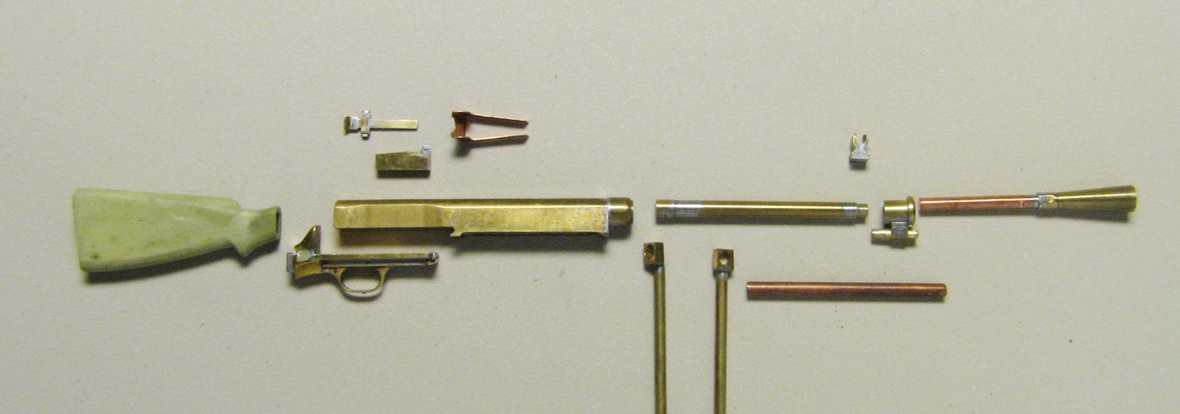 Ещё раз P.S. Нужно заметить, что скоба (пулемёт ДП) припаяна к спусковой раме, это отдельные детали. Ввиду того, что использовался среднеплавкий припой в цвет латуни (пайка осуществлялась горелкой), создаётся впечатление, что это цельная деталь. Собственно спусковая рама, так же состоит из нескольких деталей (из 5-и + скоба = 6 деталей и плюс деталь, посадочное место приклада, итого 7), которые паялись, как горелкой и среднеплавким припоем, так и обычным ПОС-61.