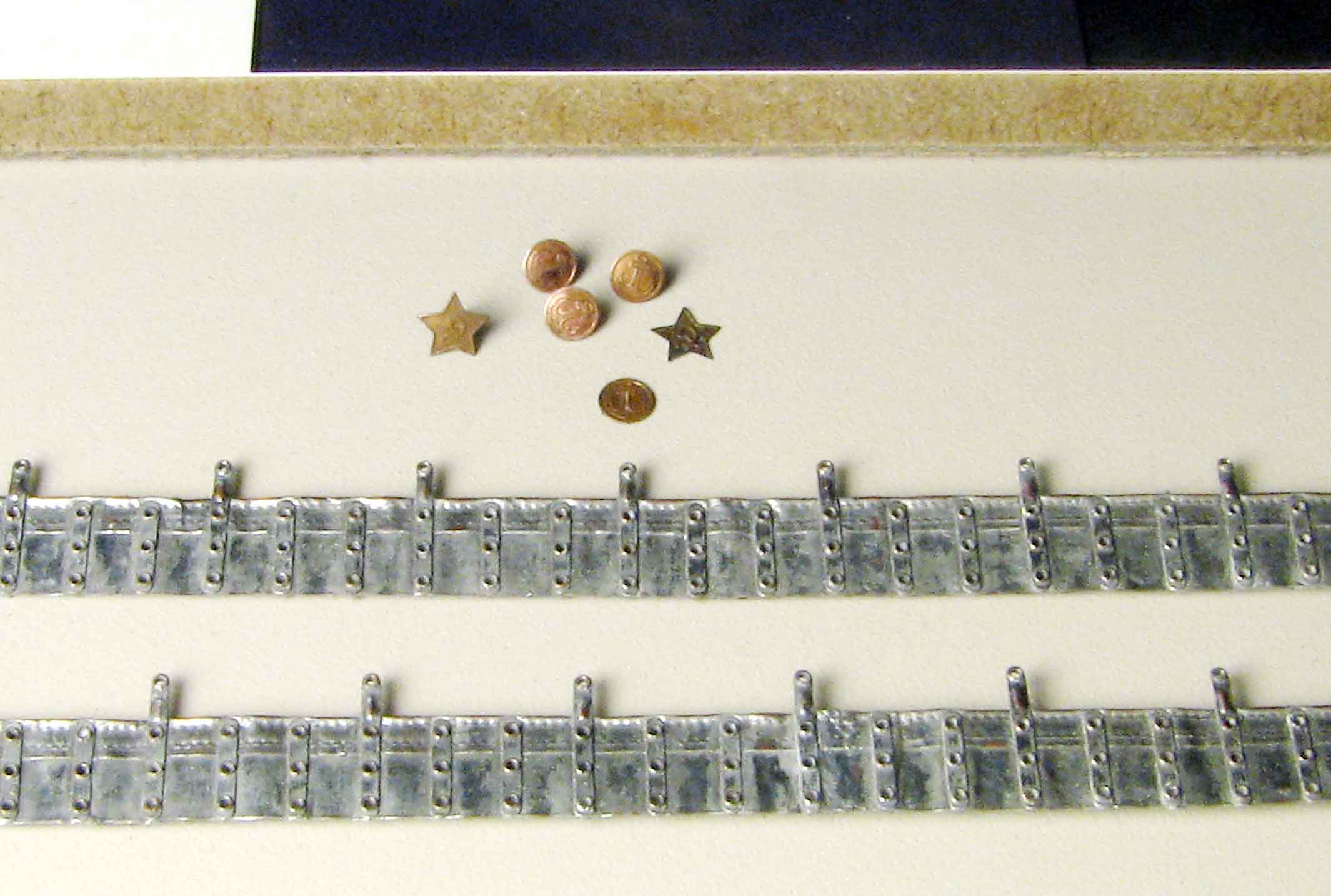 dpl, лента двухстороняя, то-же самое, но без строчки, с обратной стороны, в смысле это две совмещённые ленты. Потом ленты набьются патронами, однако может действительно будет смотреться немного тонковато. Если взять медь толще, то не получилась бы строчка, во всяком случае, как сделать по другому, не придумал. А так, всё соответствует размеру, за исключением ширины