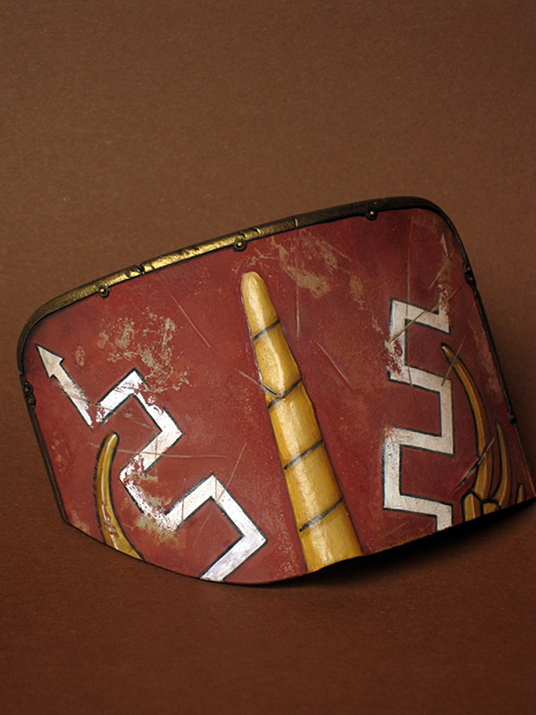 . Превосходный центурион . Фалеры и прочее бронзово - железное, вещь. Как вариант , можно сильнее сделать перепад между базовым(глянцевым) покрытием щита и матовыми эксплуатационными примочками . Так будет еще эхфектней