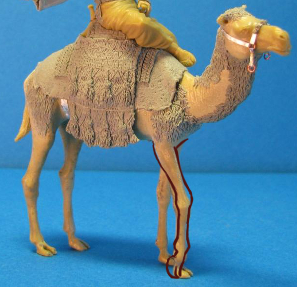 Петруха, Хорошие персонажи. Особенно верблюд порадовал. Единственный момент - при такой согнутой передней ноге стопа(пальцы) не будет полностью стоять на земле, иначе он ногу сломает. Правильней было бы сделать как на рисунке(см. ниже).