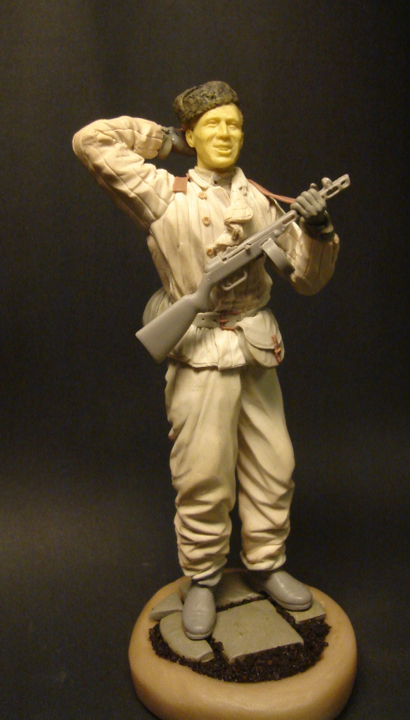 Отмечусь и я. Осенний отпуск как нельзя кстати совпал с творческим порывом. В результате получился вот такой персонаж, лично у меня возникло такое названий: "Василий Тёркин в Берлине" Масштаб 1/16, лепил из Фимо-софт, эпоксилина. Голова - 5,45, ППШ от Тамии, как и сапоги - ну не получается у меня обувь(((