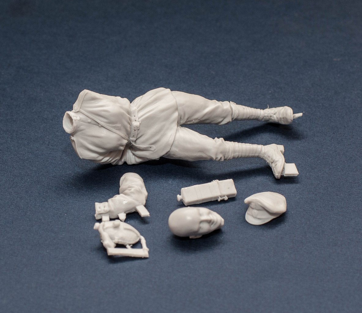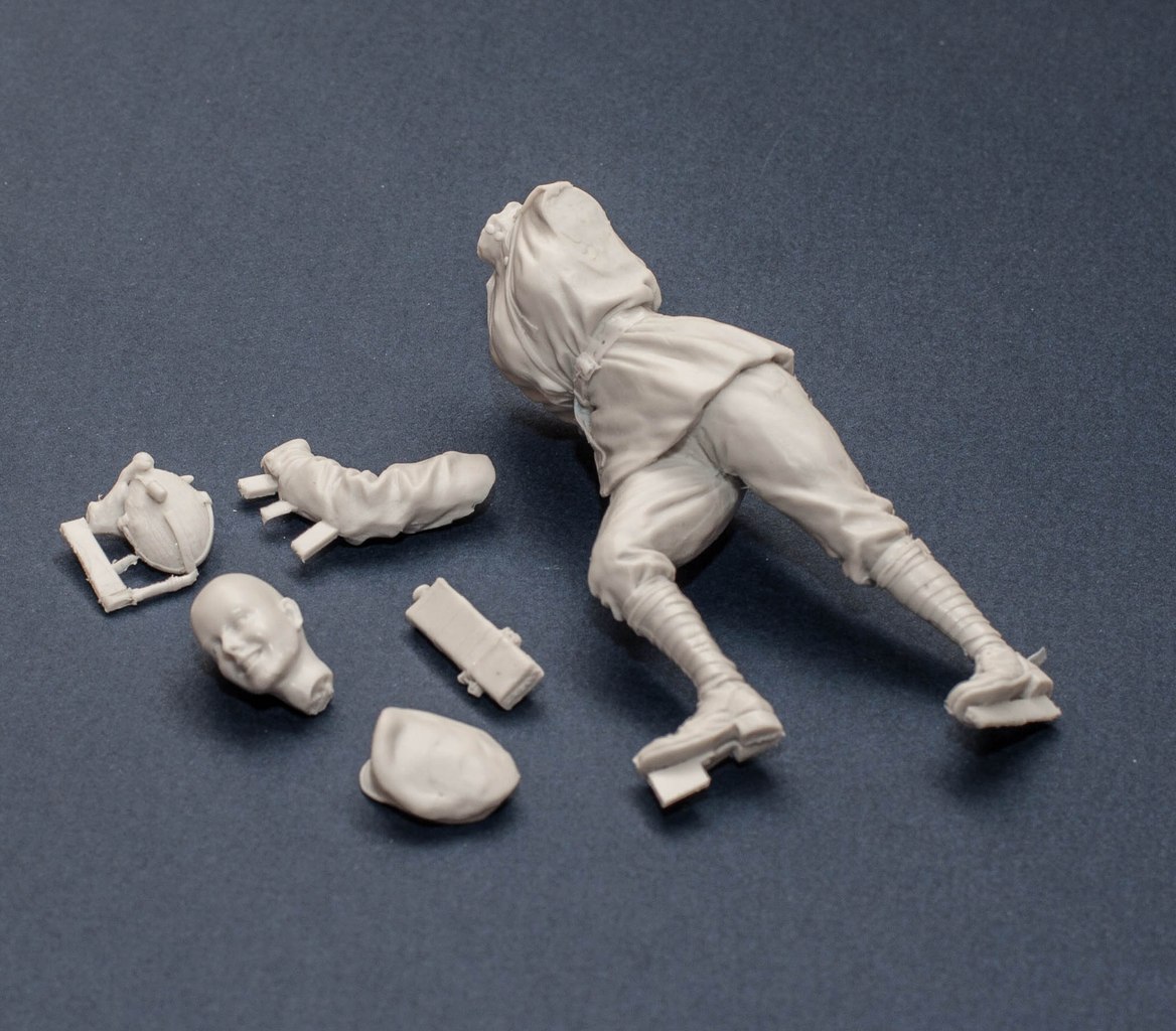 Соглашусь по поводу рук. Голова ещё в рамках возможного соотносится с телом, но кулачищи уж больно ядрены, заменить бы. Ещё советую обратить внимание на пропорции подсумков. У вас они получились слишком высокими, в реальности они были несколько более вытянуты в горизонтальной плоскости. А так симпатичная работа выходит.