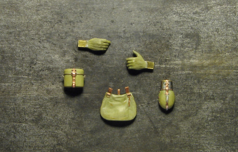 Немного о мелочах - фляга, котелок, сухарка (и D-кольца), изготовлены по размерам с оригинальных вещей, правда котелок был наш, СССР-овский, замеры других артефактов любезно предоставили добрые люди на форумах реконструкторов и местные форумчане, за что ещё раз хочу выразить им благодарность. Так же, по размерам сделаны все ремешки, тренчики и заправлены по настоящему, как в жизни, через проушины в пряжку и т.д., а вот зашнуровать ботинки не удалось, пришлось отрезки вклеивать в дырочки. Задолбали они конечно, эти самые размеры.