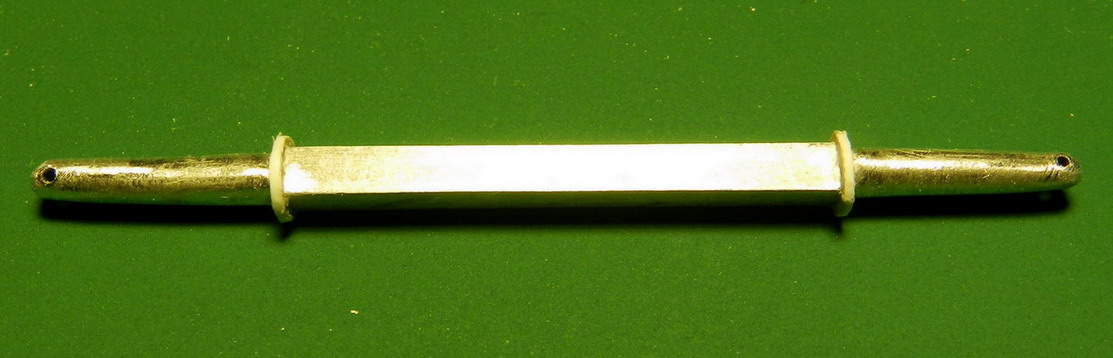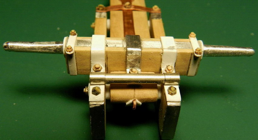 Продолжаю последовательно показывать работу над лафетом. Металлическую ось проковал из аллюминия. На короткие станины из прокованного припоя сделал оковки и поставил разделительные щайбы. Из листового полистирола изобразил оковки на стреле. Соединил короткие станины со стрелой и осью.