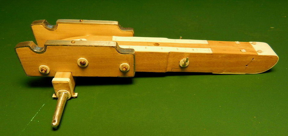Далее по заводскому плану, передок осадный. Этот передок интересен тем, что потом он практически без изменений был применён для осадных орудий 1867 и 1877 гг.Я делаю модификацию 1839 г. Он состоял из массивной центральной стрелы, двух боковых сниц, боевой металлической оси, неподвижной ваги (прикреплённой болтами к сницам и стреле) и подвижной ваги (привязываемой верёвками к неподвижной).