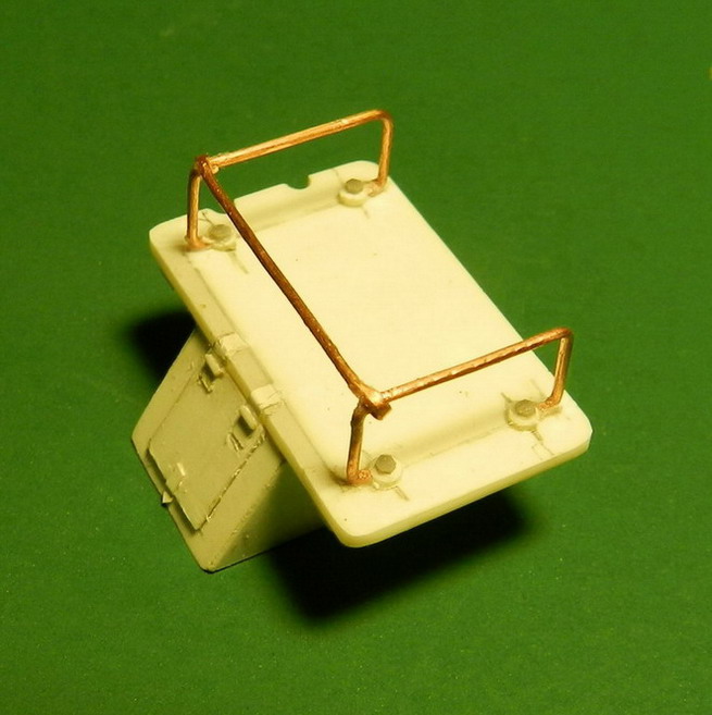 Спереди, возле оси, закреплены железные трубки для помещения в походном положении медного футляра с подъёмным винтом.
