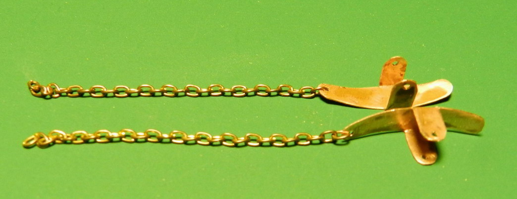 Из листовой меди изготовил тормозные колодки и прицепил к ним латунные цепочки.