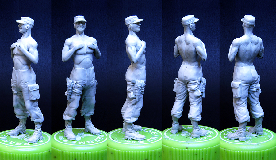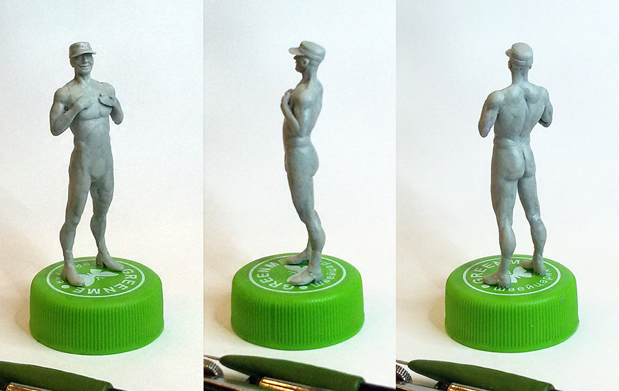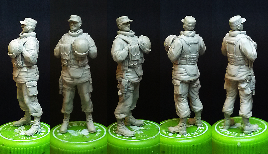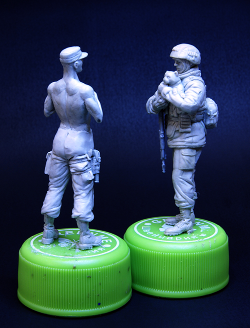 Сам по себе стал лепиться офицер в дополнение к товарищу с котом. Рост фигурки в ботинках и фуражке полевой летней - 52 мм (1 м 82 см), офицера минус ботинки и фуражку: 1 м 76 см - 1 м 78 см. Руки под бронежилетом. Постарался выставить естественную позу. Поработал с анатомией.