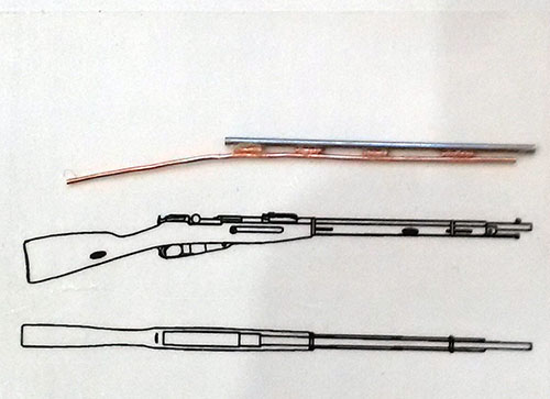Чертёж драгунки и заготовка из иглы шприца и проволоки перед формированием ложа из Magic Sculpt.