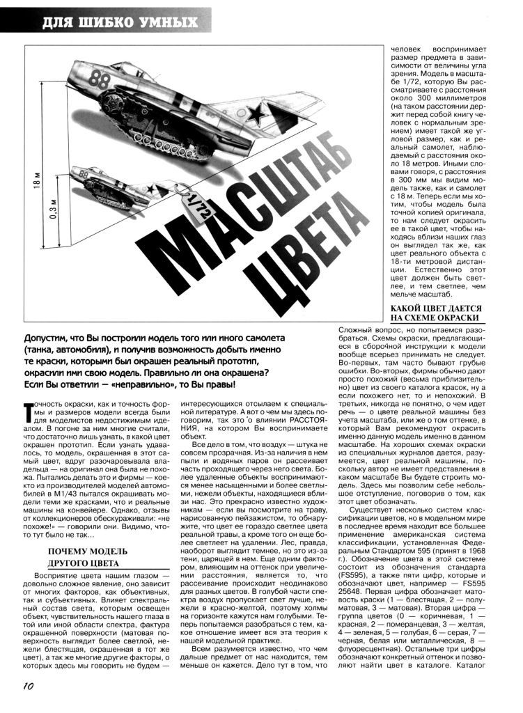 Слегка поддержу тему, касательно масштаба цвета, небольшой статьёй в журнале М-хобби из далекого 1995 года. Основная мысль повествования относится к моделированию бронетехники, но думаю без особого труда можно некоторые тезисы запараллелить и в сторону окраски фигур. Думаю, информация будет полезна, но она ни коим образом не снимает возможные сомнения в части нюансов, оттенков и восприятий, отдельно взятого цвета.