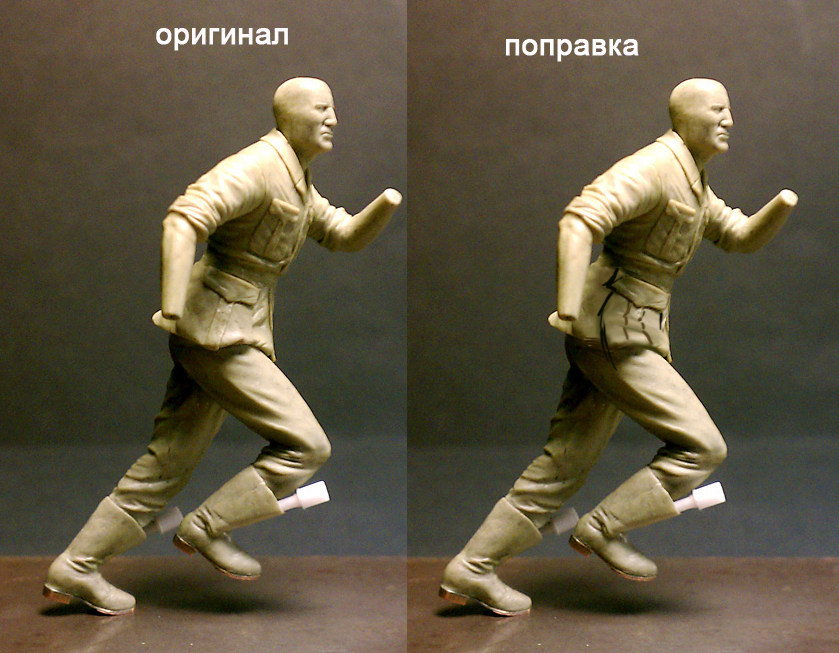Ну, можно его немного в пояснице нагнуть. Тогда будет более пригибающийся на бегу солдат. Хотя бегать по разному можно.