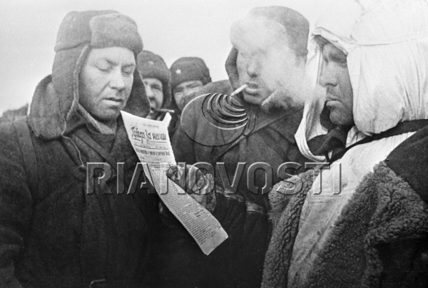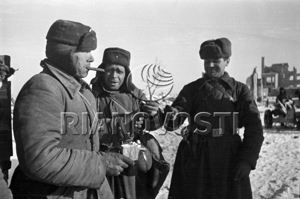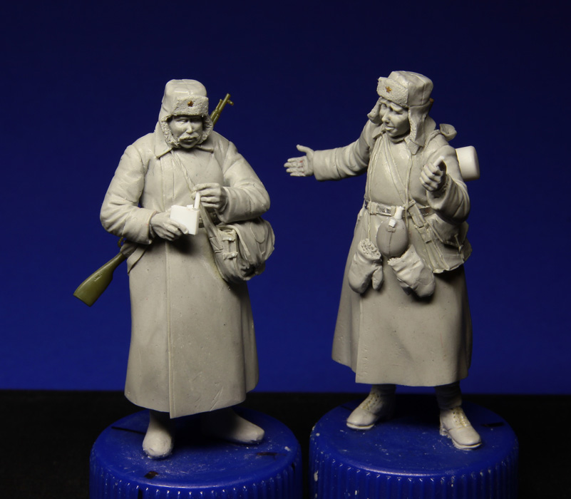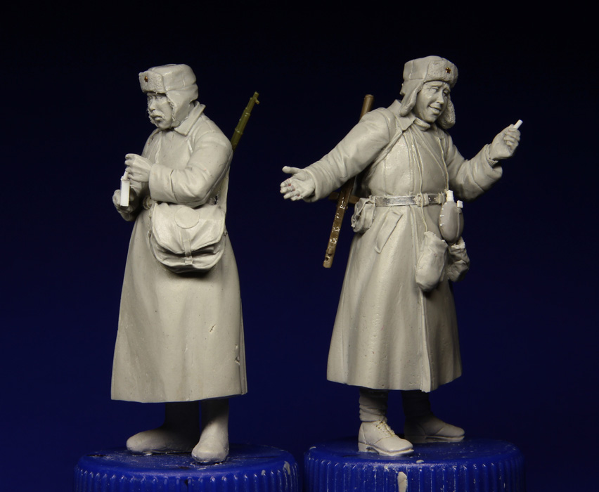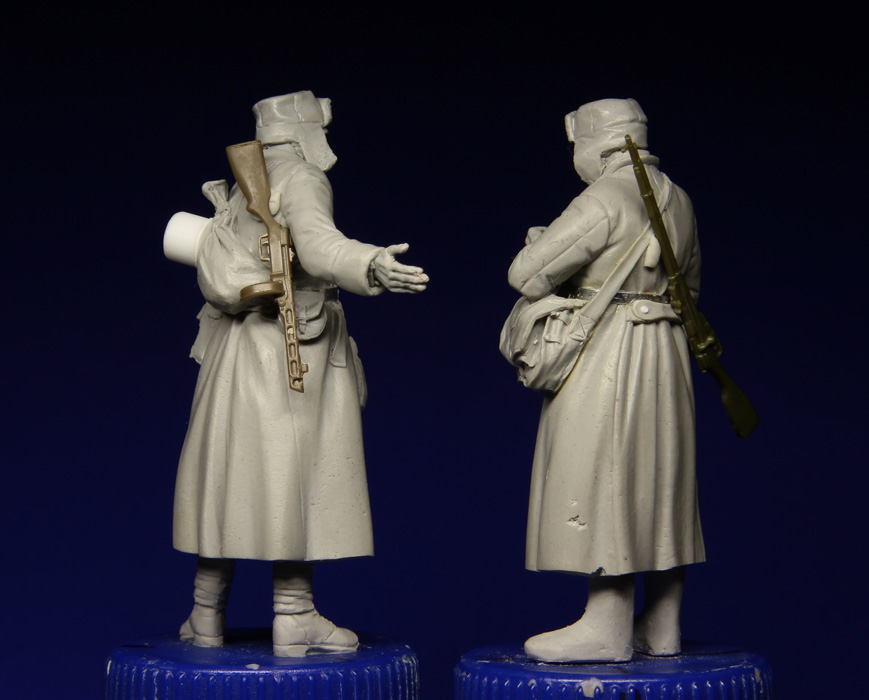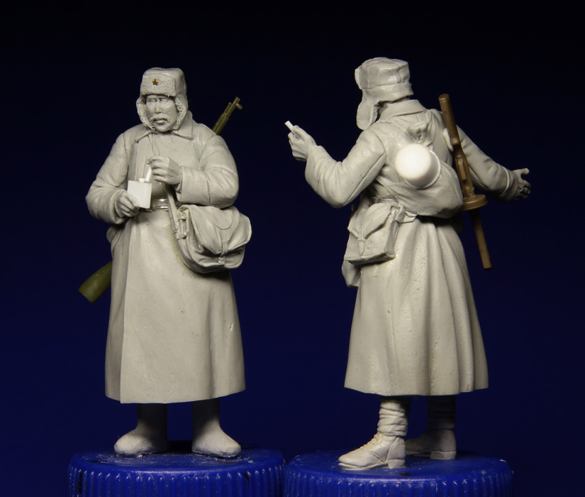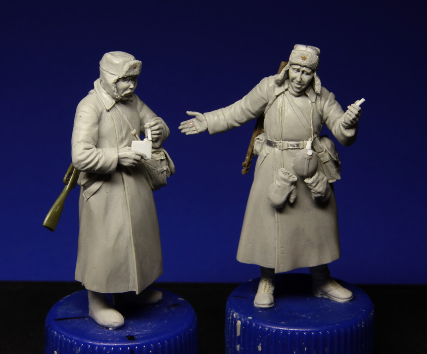 Ещё пара наших бойцов шуткует и пробует немецкие сигаретки. Давно хотел сделать таких плотно укутанных наших пехотинцев, фотографии долго собирал, поэтому и работа спорно шла.