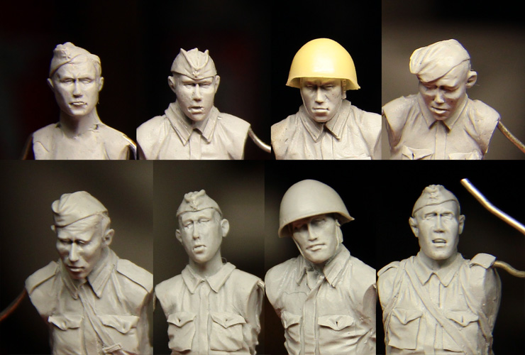 Лица да, наверное, есть какой-то типаж к которому тяготеет рука и это у всех так кроме хороших портретистов. Но я постоянно фотографии смотрю, пытаюсь сделать разные типы лица и головы. Вот сейчас работаю над нашей пехотой на марше - вот восемь лиц - ну неужели прямо уж так они сильно друг на друга похожи?