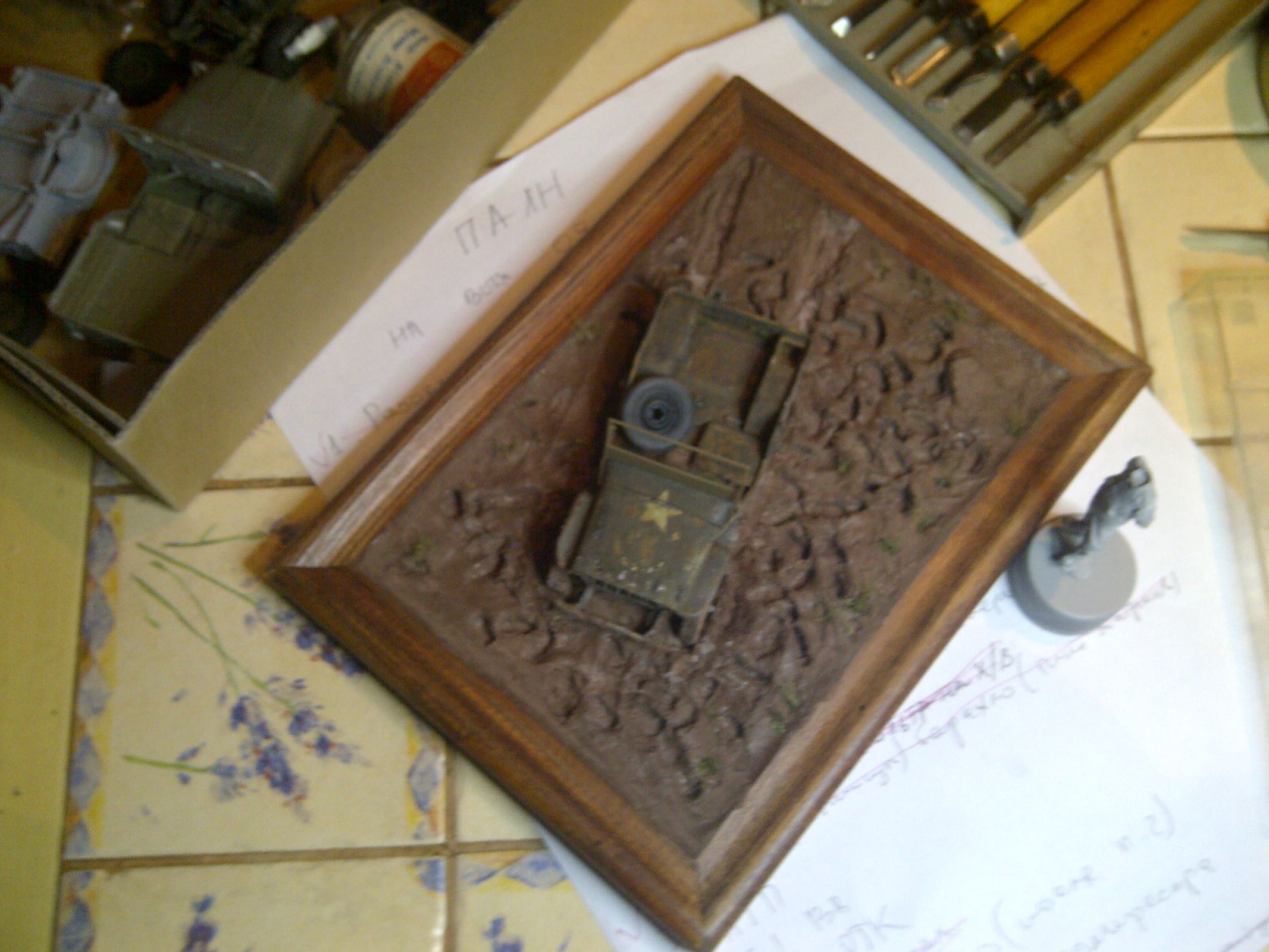 Правильно всё и планировалось.Когда всё закручено на сюжете, жанровой сценке - фигурка должна быть полностью подчинена именно этому, без взирания на то, лицом она к зрителю или спиной. В данном контексте нужна композиционная связь, "диалог" джипа и фигурки, поэтому лицом к джипу - это естественно и абсолютно нормально.